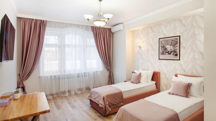В номере установлены две комфортные односпальные кровати с ортопедическими матрасами, которые обеспечат качественный сон и отдых, по запросу кровати можно соединить.