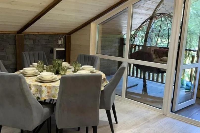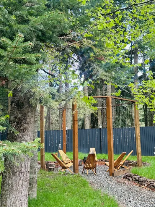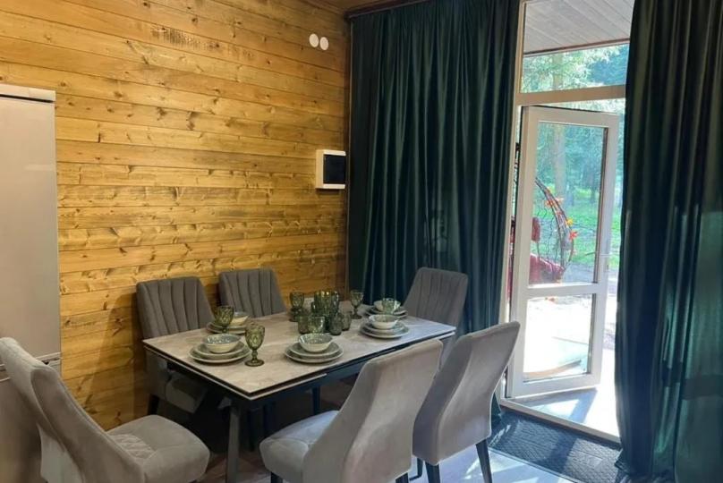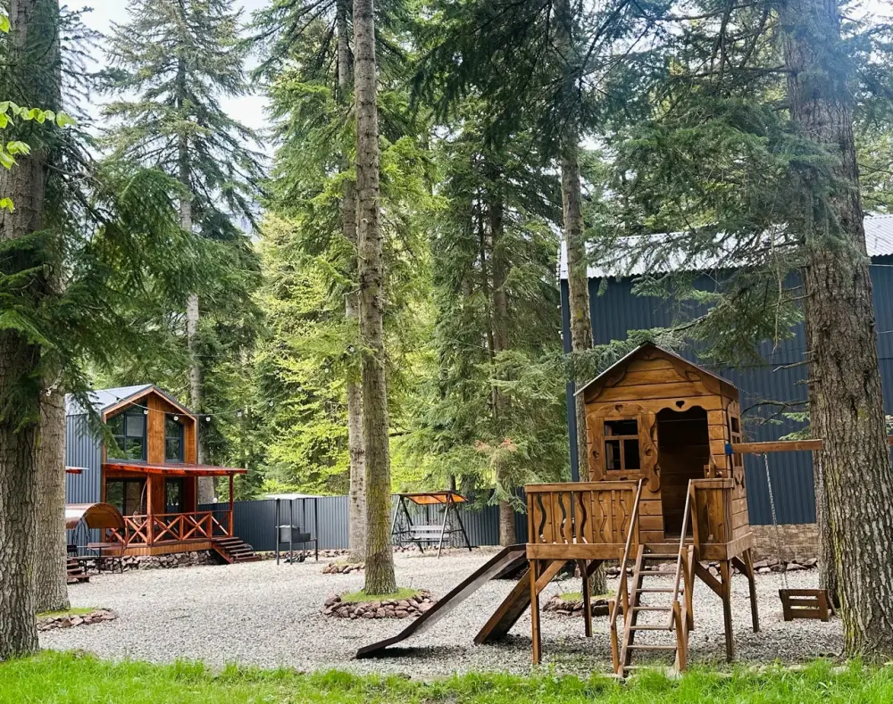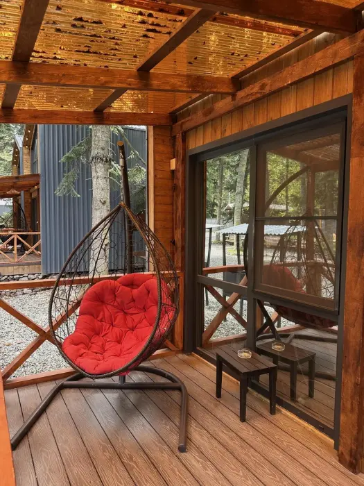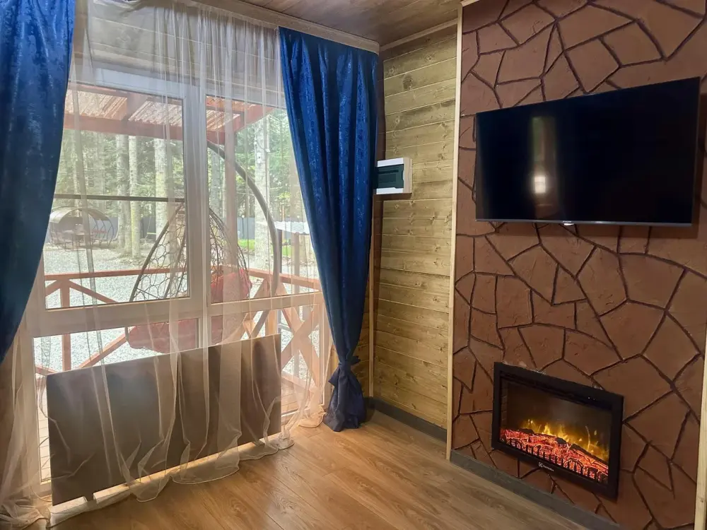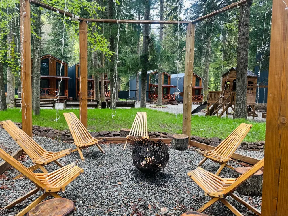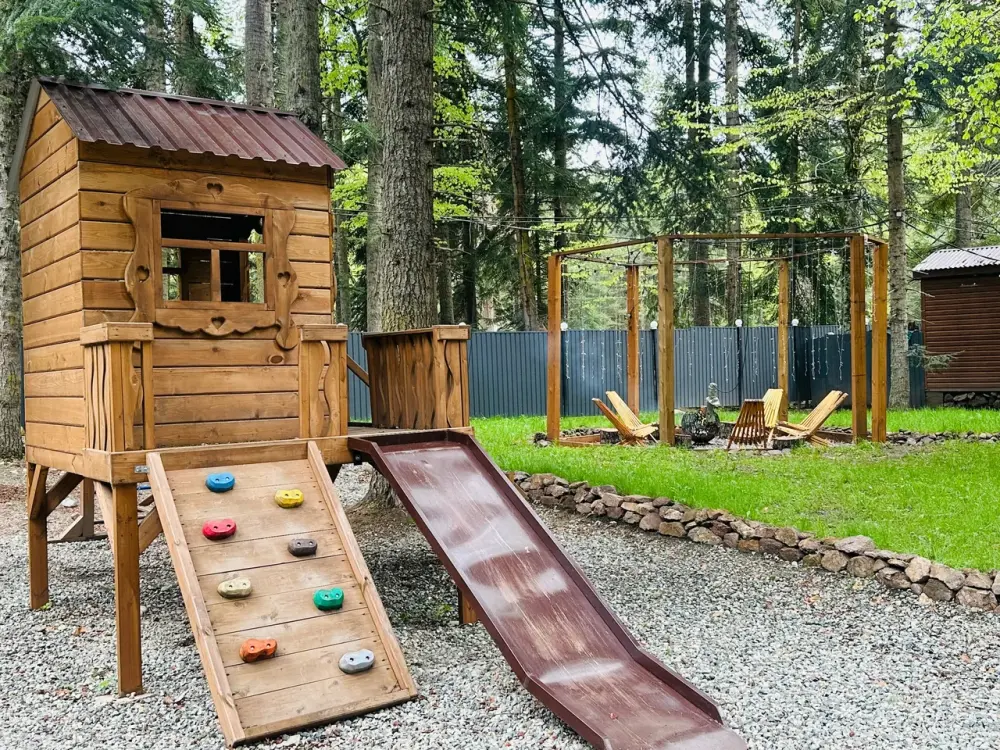 На территории: детская площадка, батут, очаговая зона для уютных вечеров, баня на дровах, мангальная зона и беседка у каждого домика (шампуры и казан есть), парковка.