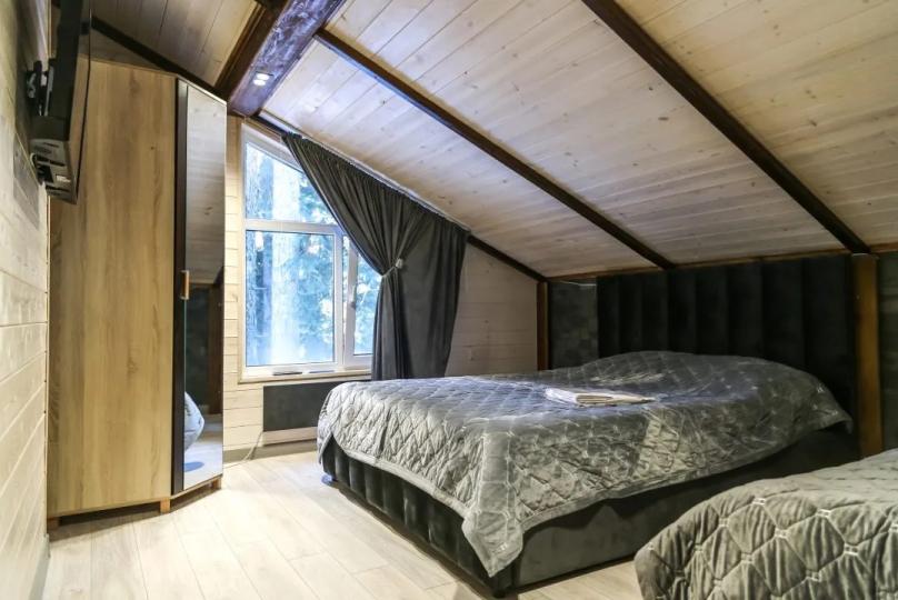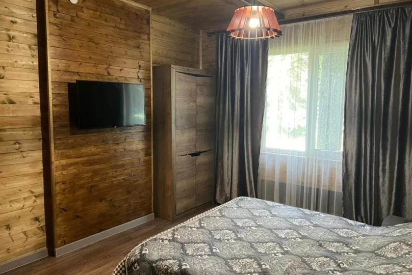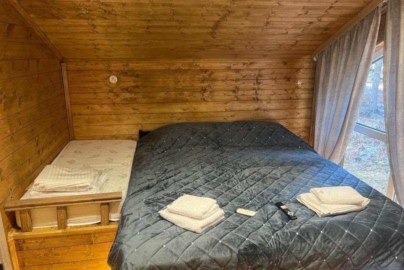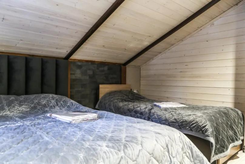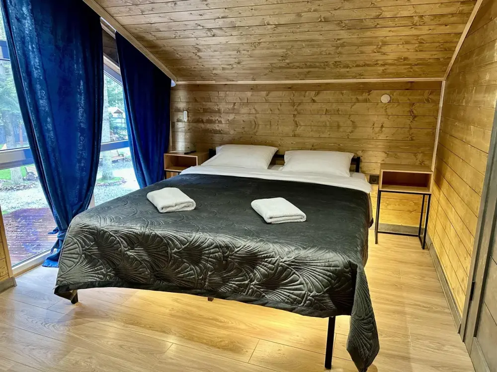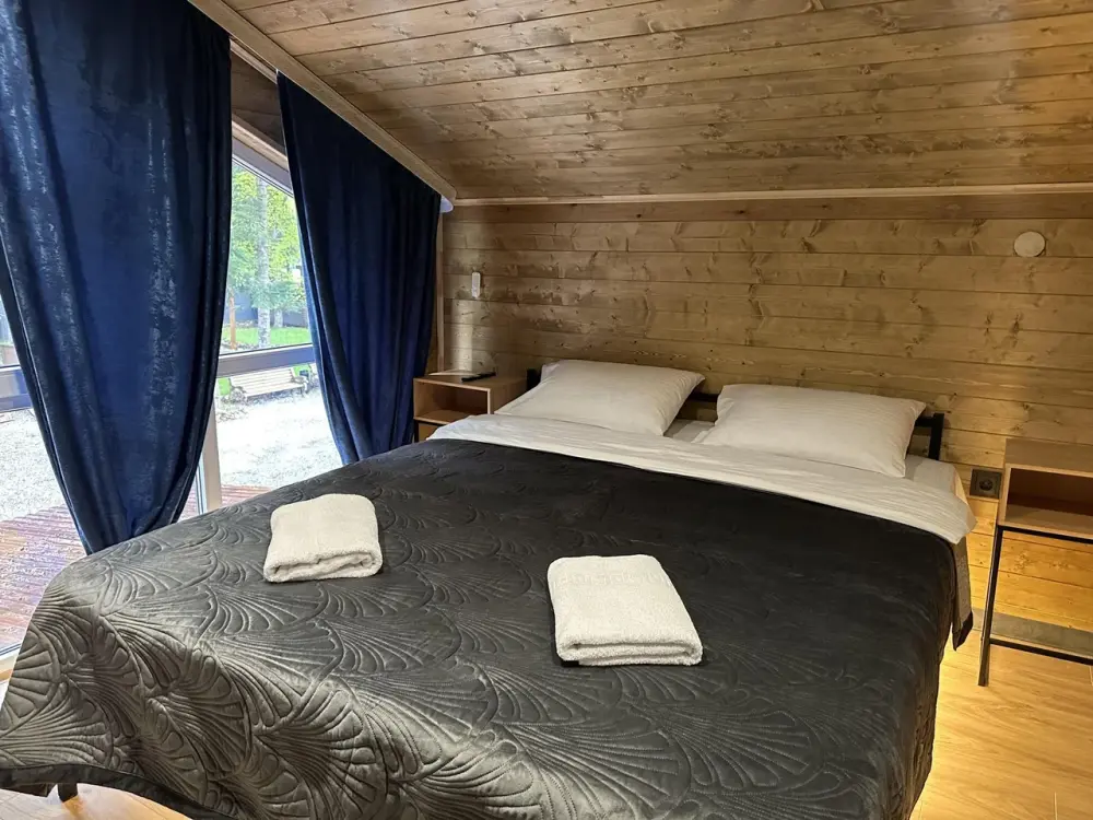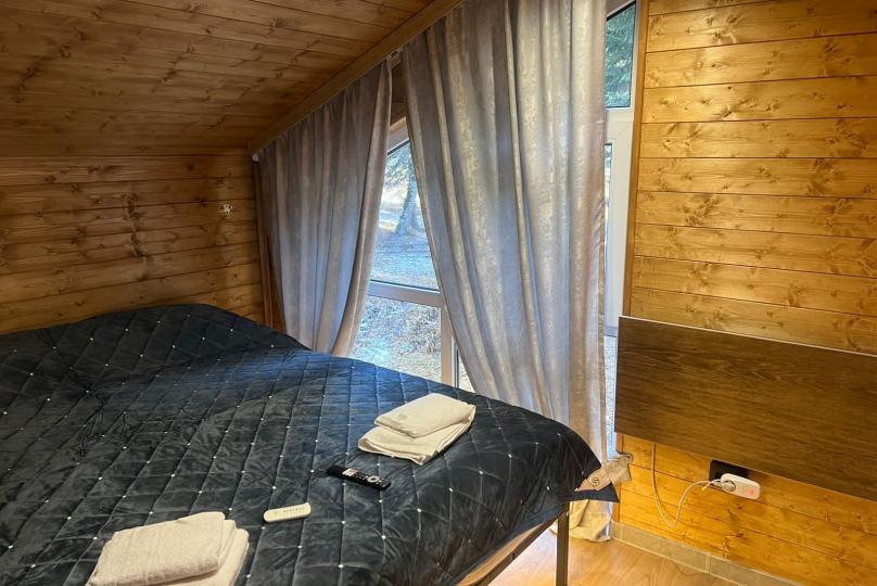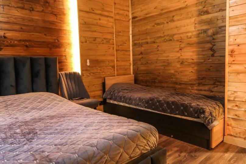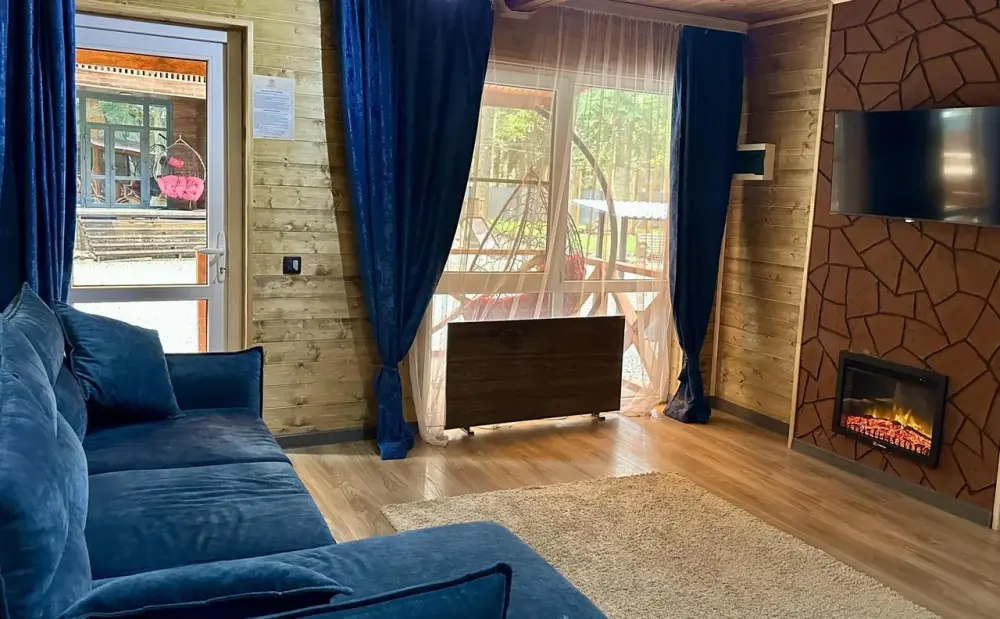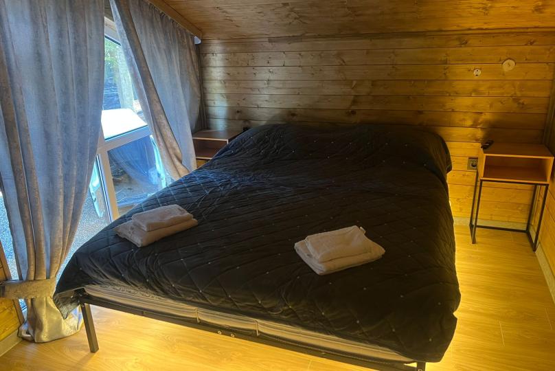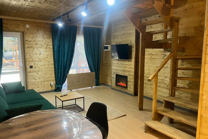 Каждый коттедж рассчитан на проживание 6 человек: кухня-гостиная, изолированные 2 спальни, 2 санузла. Кухня: холодильник, микроволновая печь, плита, посуда, принадлежности для приготовления, стол, стулья. Гостиная: двуспальный диван, камин, телевизор, Wi-Fi. Спальни: двуспальная кровать, прикроватные тумбочки, шкаф, телевизор. На каждом этаже свой санузел.