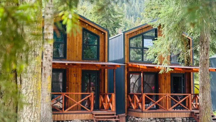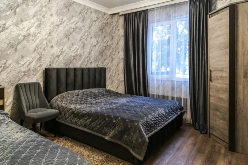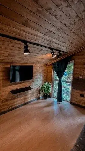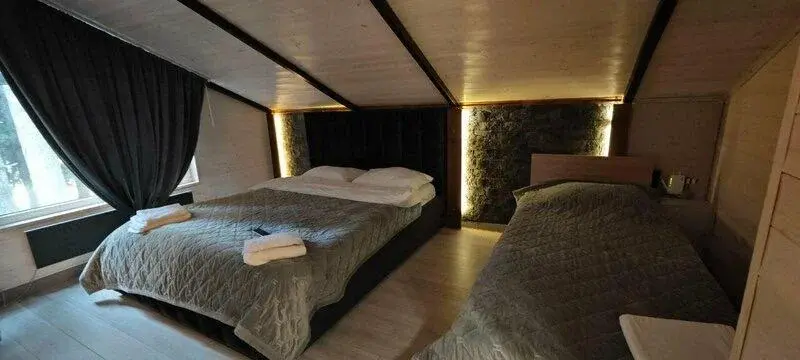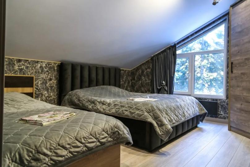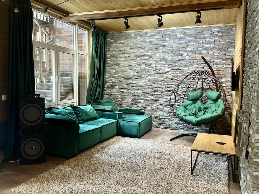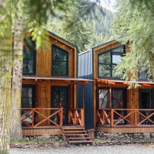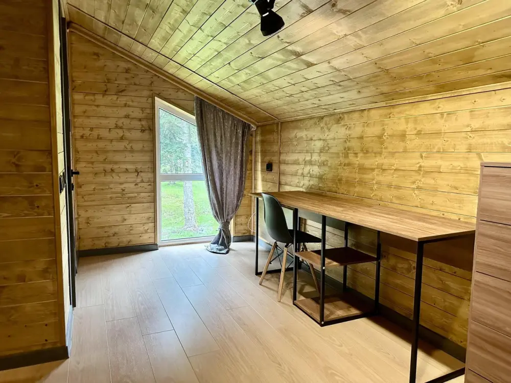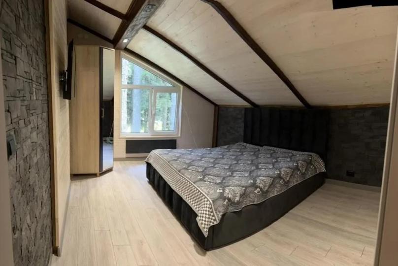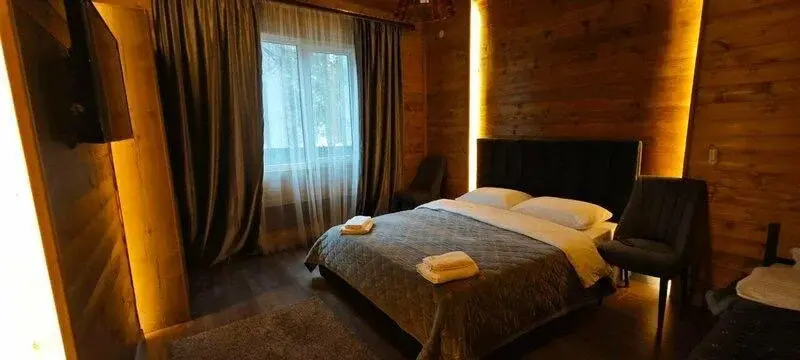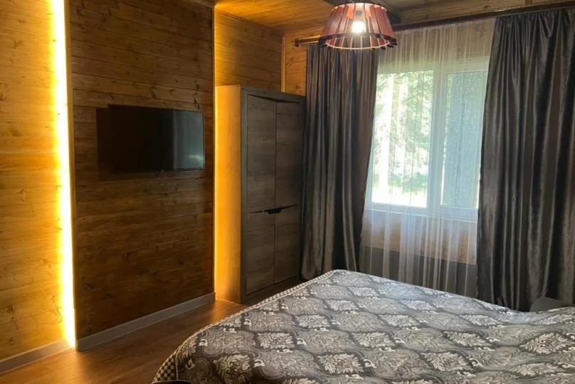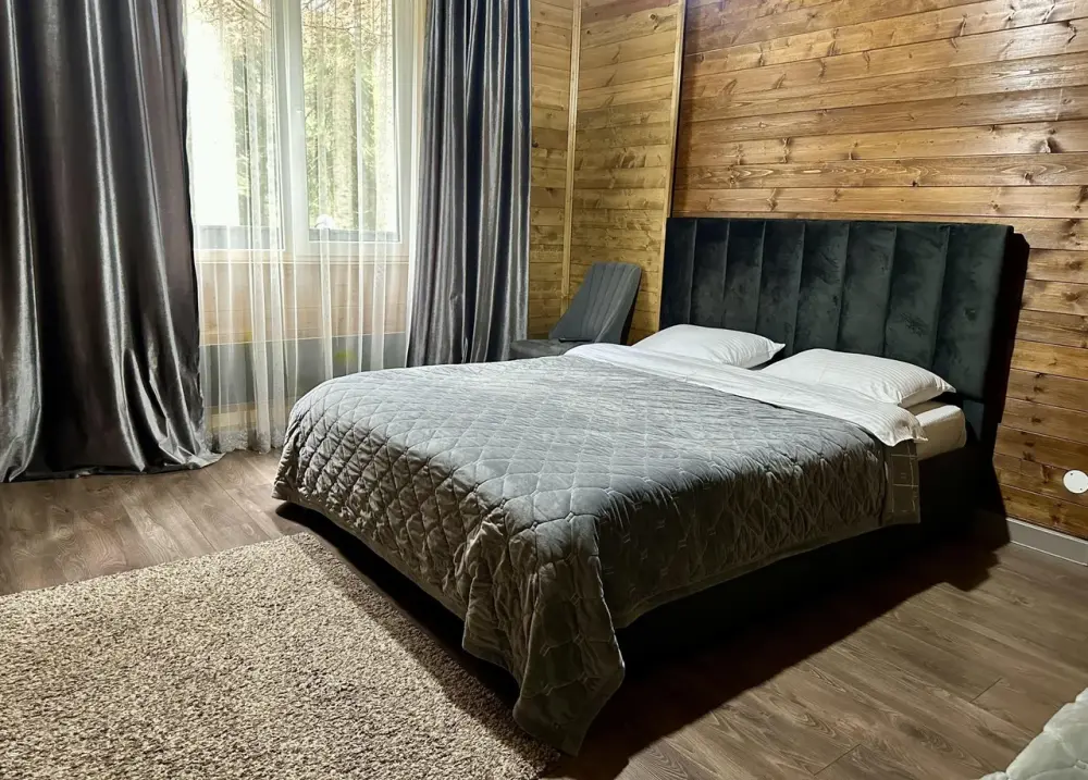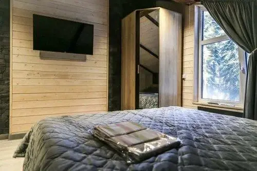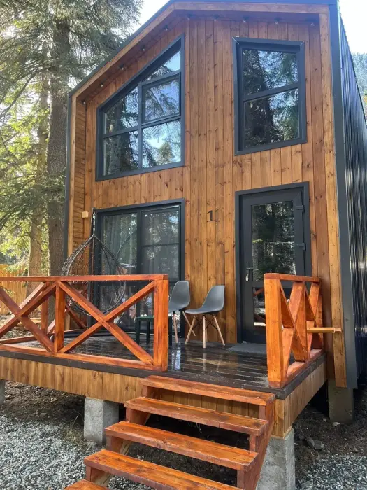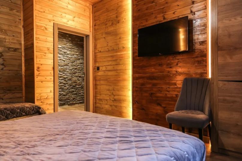 Каждый коттедж рассчитан на проживание 6 человек: кухня-гостиная, изолированные 2 спальни, 2 санузла. Кухня: холодильник, микроволновая печь, плита, посуда, принадлежности для приготовления, стол, стулья. Гостиная: двуспальный диван, камин, телевизор, Wi-Fi. Спальни: двуспальная кровать, прикроватные тумбочки, шкаф, телевизор. На каждом этаже свой санузел.
