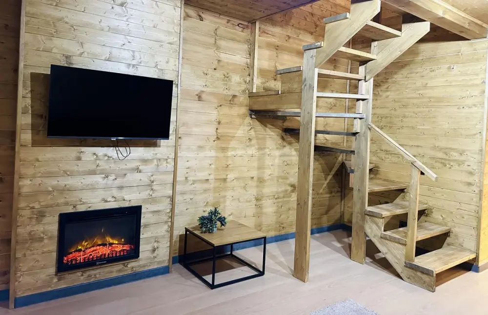 Каждый коттедж рассчитан на проживание 4 человек: кухня-гостиная, спальня на 2 этаже, 2 санузла. Кухня: холодильник, микроволновая печь, плита, посуда, принадлежности для приготовления, стол, стулья. Гостиная: двуспальный диван, камин, телевизор, Wi-Fi. Спальня: двуспальная кровать, прикроватные тумбочки, шкаф, телевизор. На каждом этаже свой санузел.