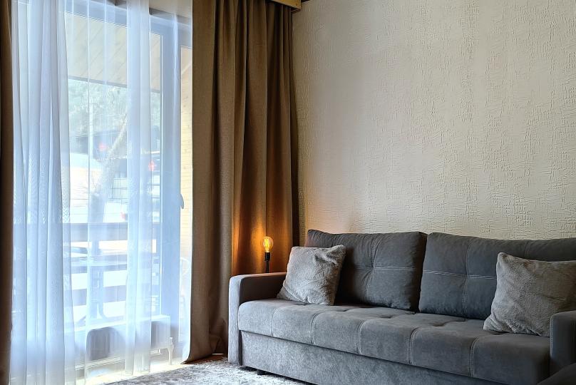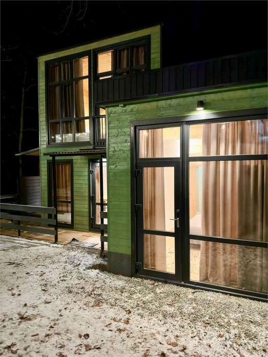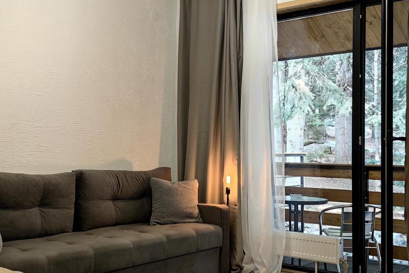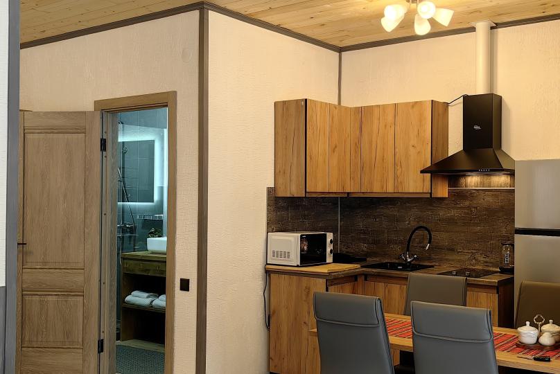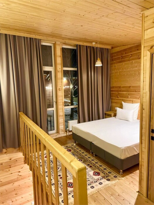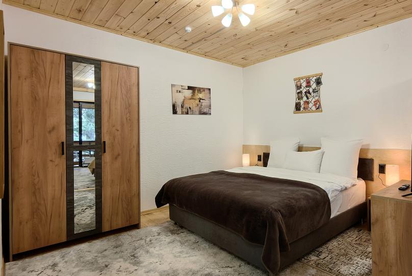 Домик с прекрасным видом на лес не оставит равнодушным даже самого изысканного любителя естественных природных пейзажей. Стоит заглянуть под завесу лесной пелены, и перед глазами открываются сказочные просторы, необыкновенно завораживающие картины живого леса. Домик рассчитан на проживание максимум 4 гостей: двуспальная кровать, односпальная кровать, а так же диван. Кухня в полностью оборудована для приготовления пищи, включая индукционную плиту, посуду, холодильник и микроволновую печь. В коттеджах также есть ванная комната, балкон, веранда.