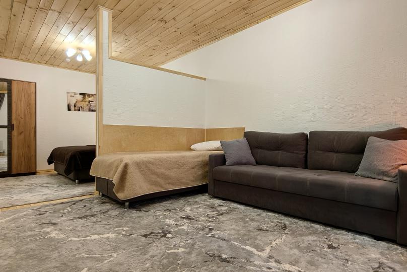 На 1 этаже в изолированной комнате располагаются 2 односпальные кровати, в зале 1 этажа располагается двухъярусная кровать ручной работы из массива сосны и на 2 этаже располагается спальная комната с двуспальной кроватью «king size».