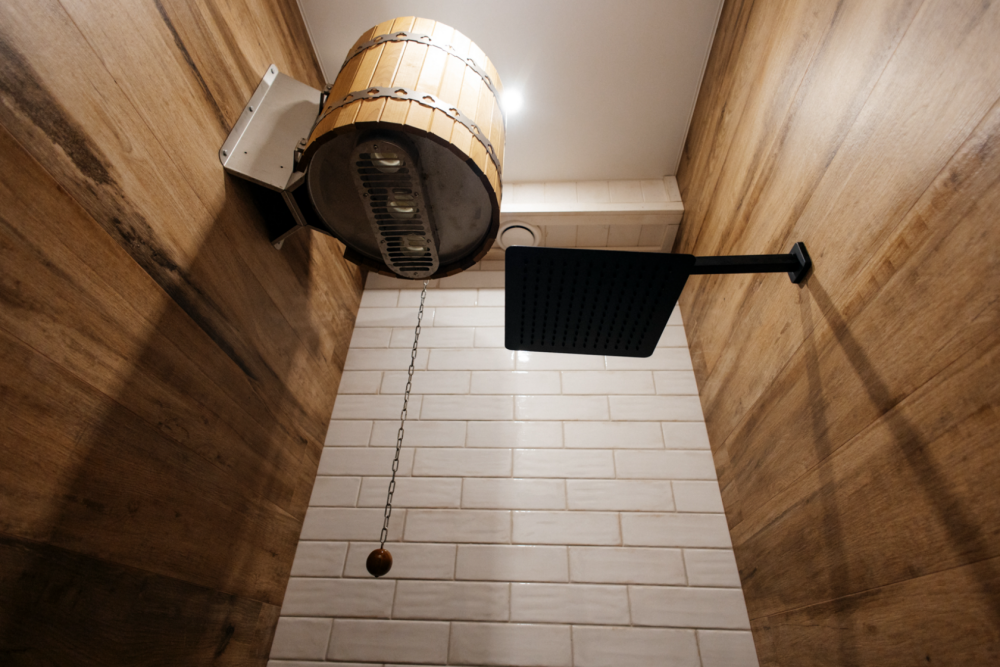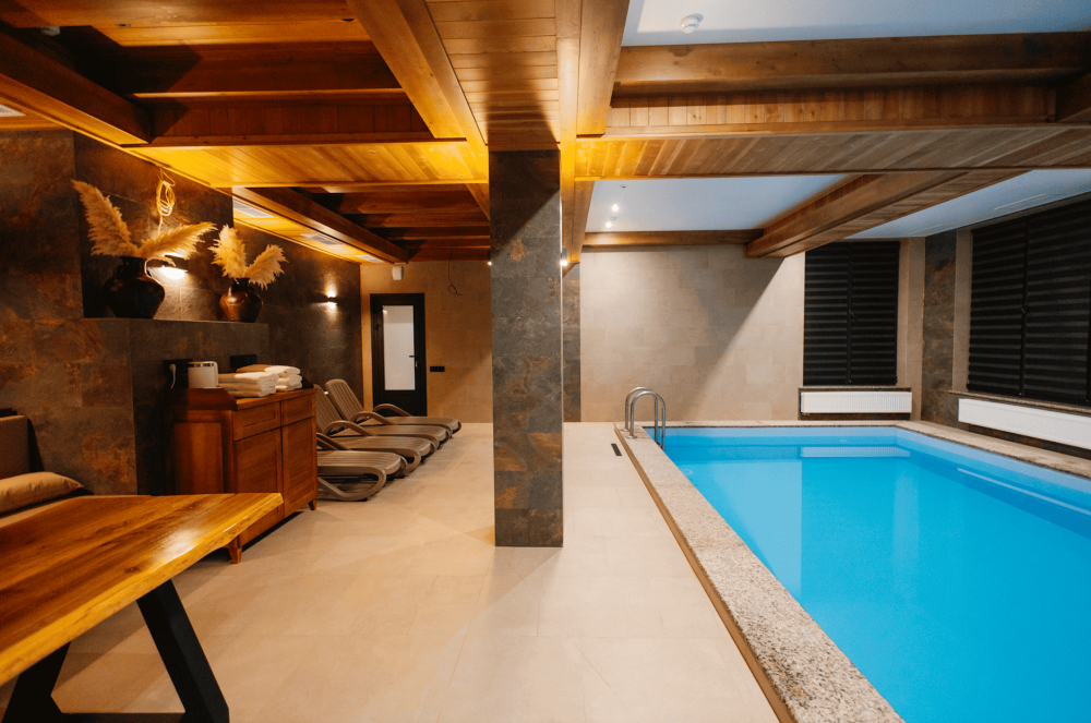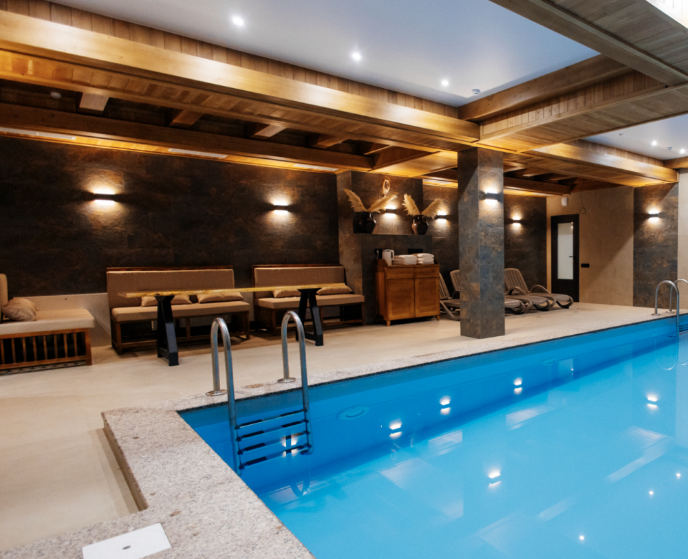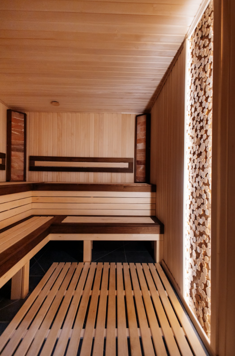 Спа-зона -комплекс теплого подогреваемого бассейна, сауны с можжевеловой стеной, соляными блоками, двумя душами с обливными ведрами и большой зоной отдыха с диваном и столом.
