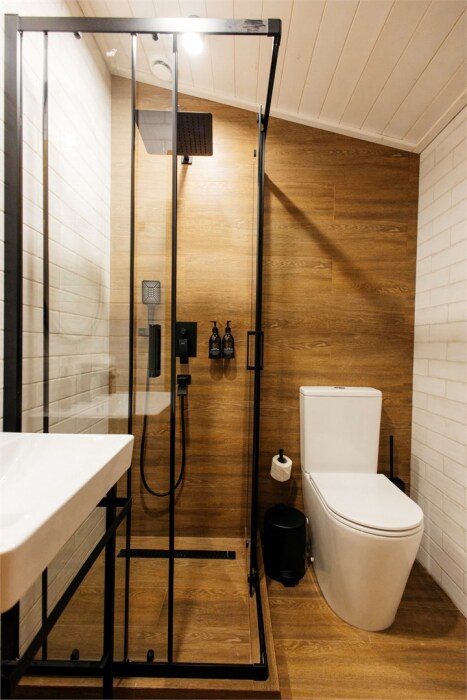 Коттедж оборудован всем необходимым для комфортного проживания: спальные места, бытовая техника, оборудованная кухонная зона, собственная ванная комната и туалет.