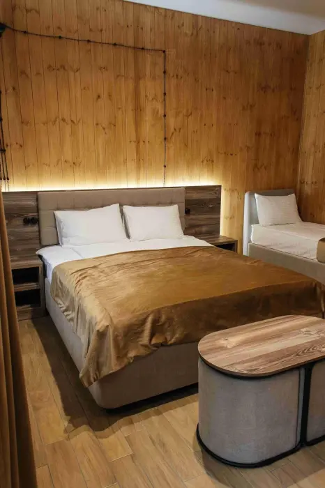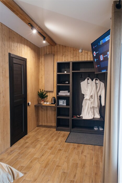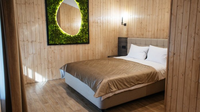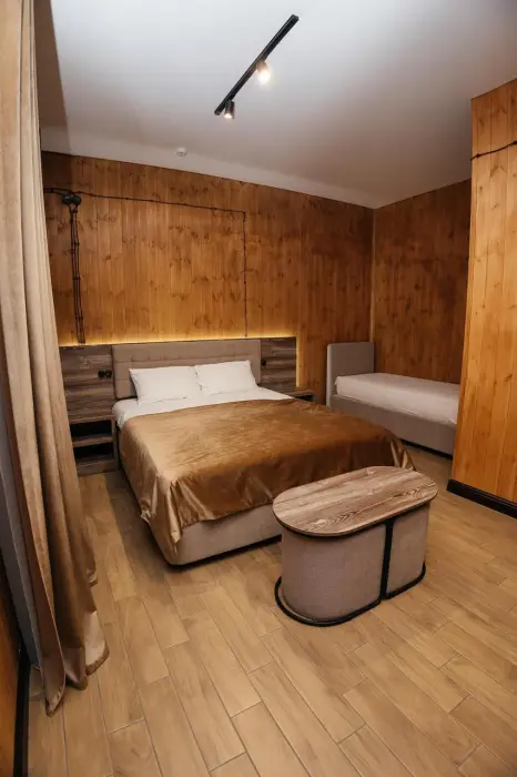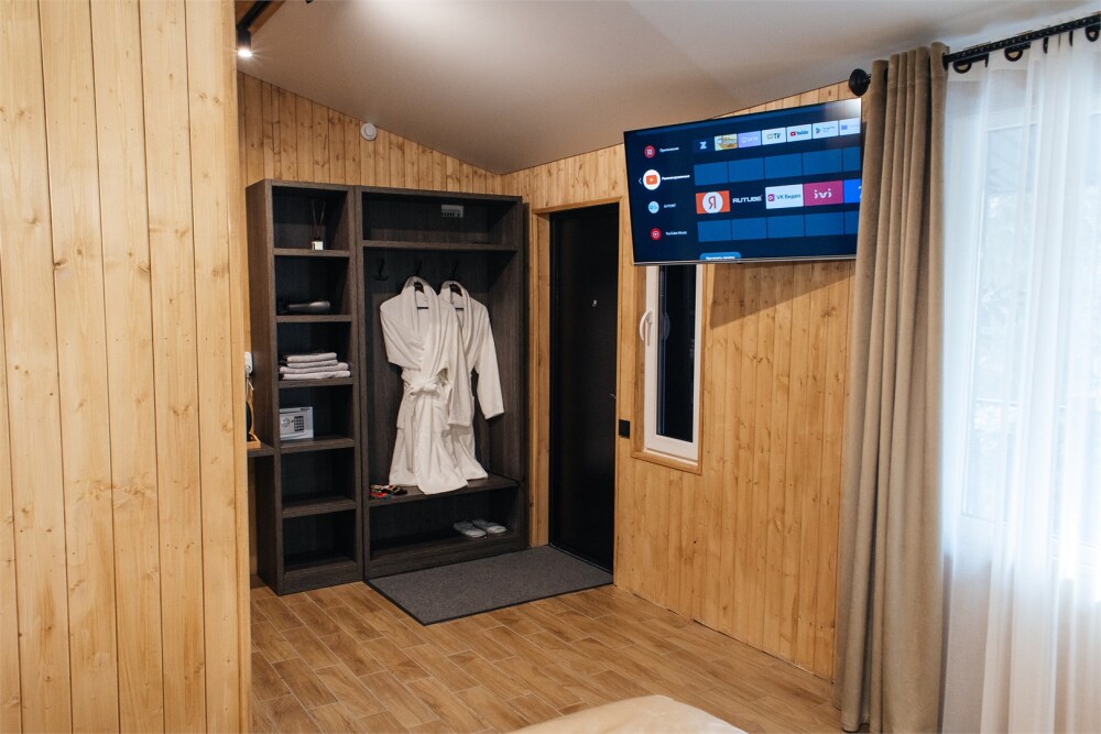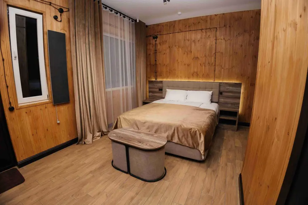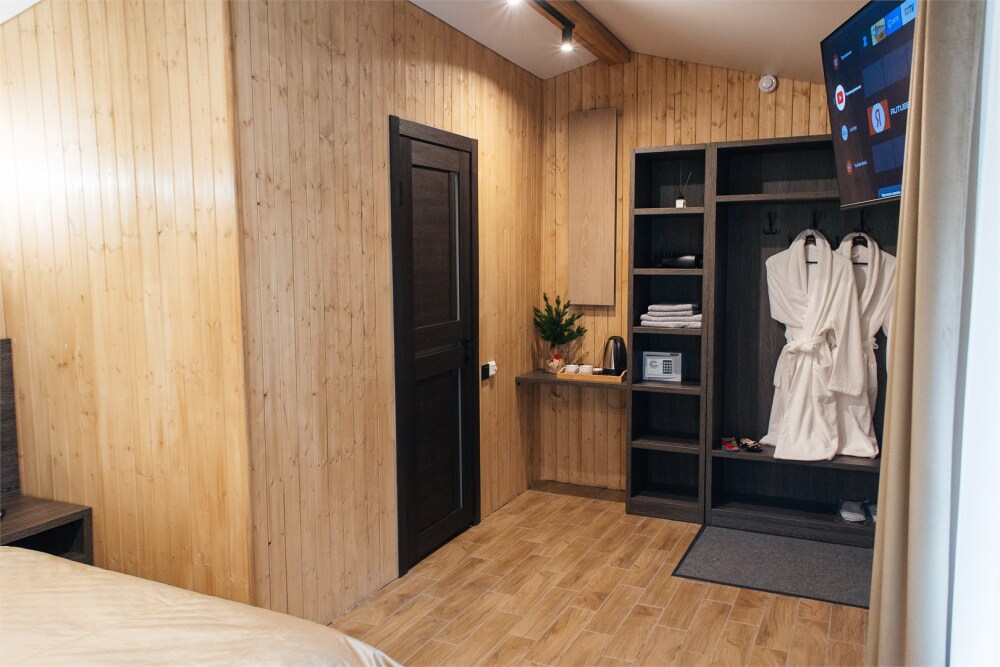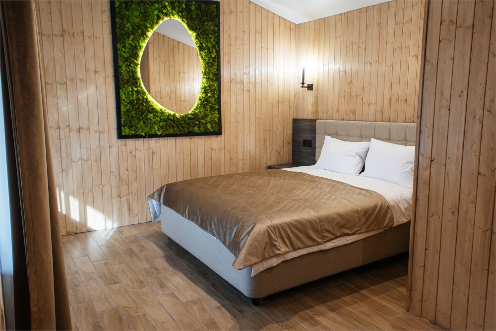 Комфортабельный номер с классическим европейским интерьером. С видом на хвойный лес. Оборудованный одной двуспальной кроватью и раздвижным креслом.