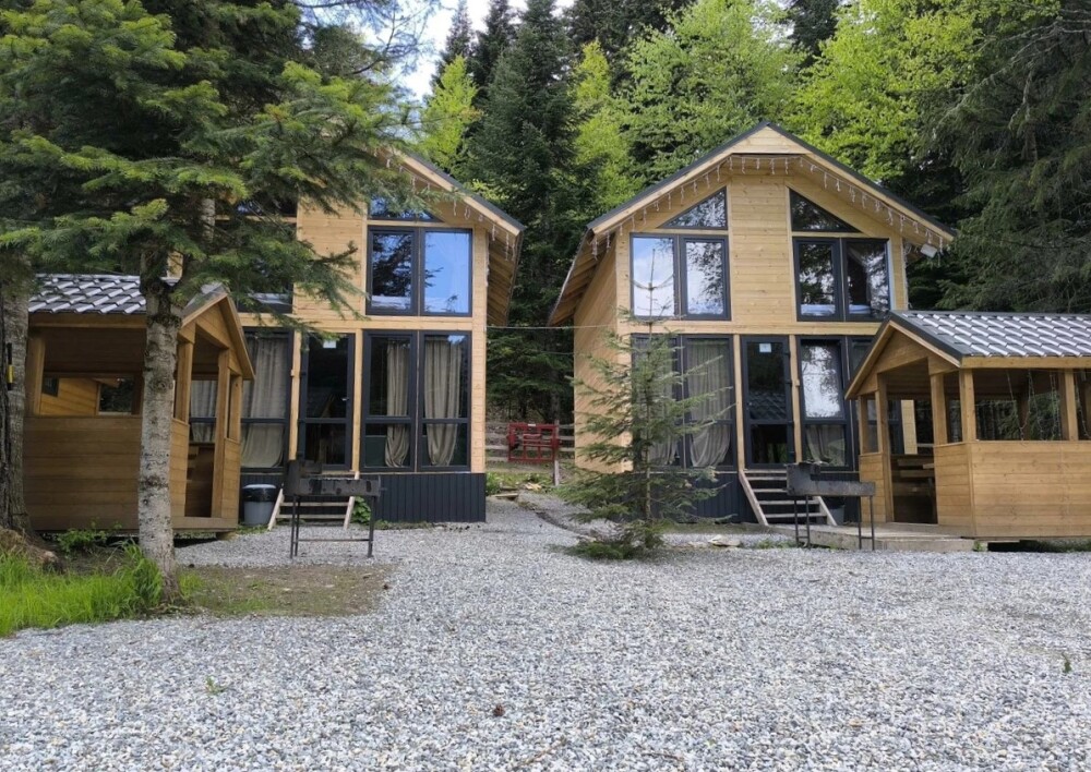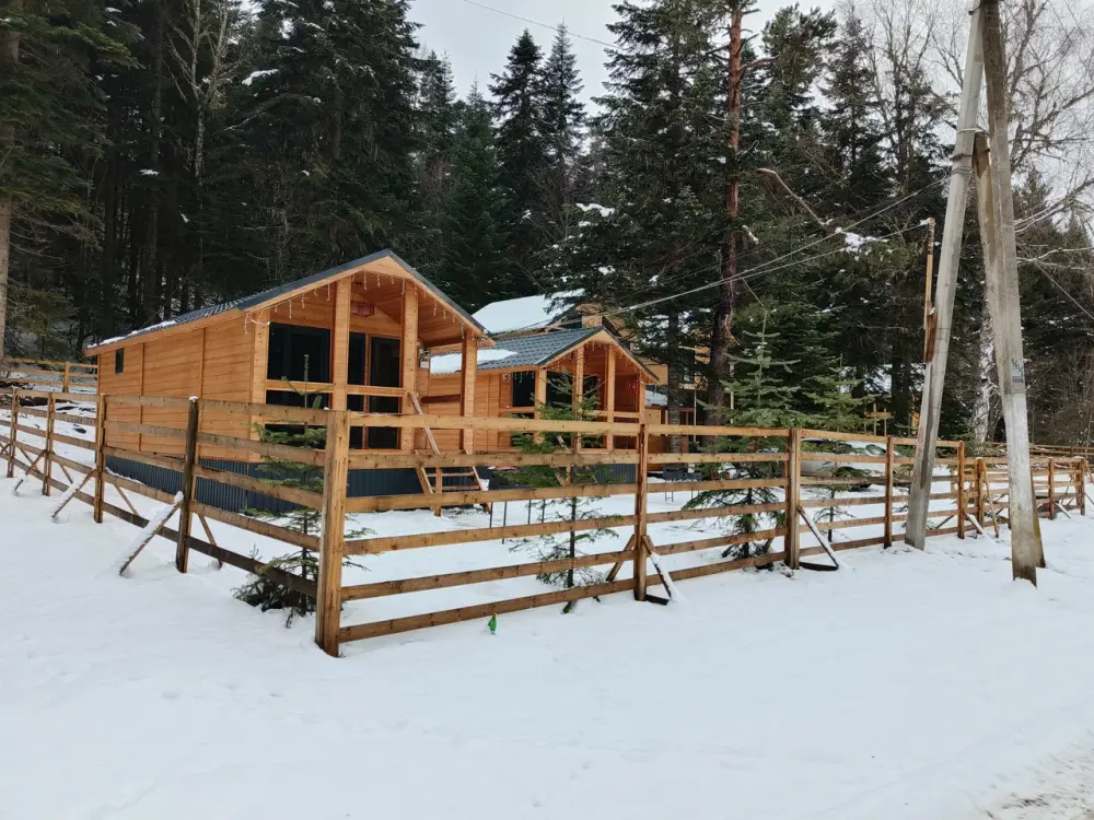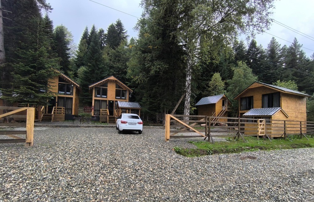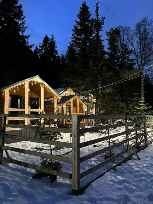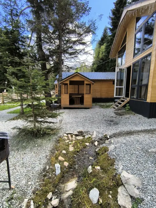 На базе отдыха два 2-этажных барнхауса, на втором этаже 2 спальни изолированные с дверьми и 2 кресла раскладные. На 1 этаже - студия с диванами раскладными, кухня и ванная комната. Дом с видом на горы и хвойный лес. Также 2 дома 2-местных, со всеми удобствами, в домах спальня и гостиная с диваном раскладным плюс кухонная зона, ванная комната и веранда.