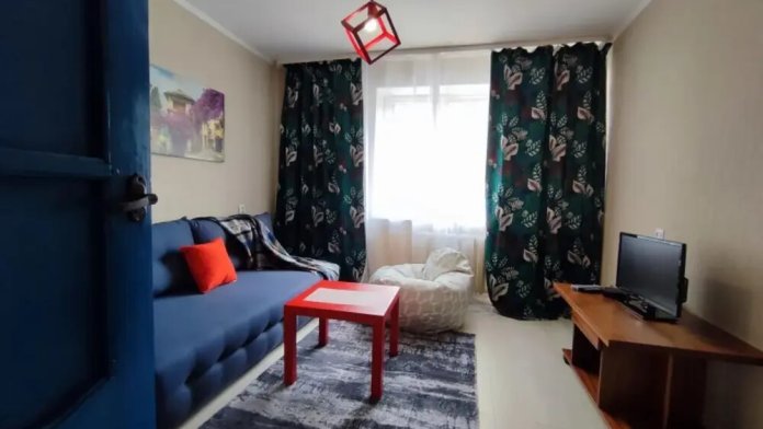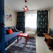 В квартире: 1 диван двуспальный. Имеются плотные шторы, кондиционер, телевизор, отопление, шкаф, вешалка, обеденный стол, рабочий стол, журнальный столик, кухня, посуда, столовые приборы, СВЧ, чайник, холодильник, плита электрическая, мультиварка, стиральная машина, сушилка для белья, утюг, гладильная доска, фен. Индивидуальная ванная комната: душ, раковина, туалет.