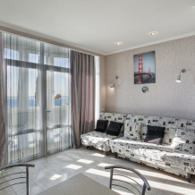 Квартиры рассчитаны на семью из 2-х - 4-х человек. В квартире: 2-х спальная кровать и (или) раскладной диван, или два раскладных дивана, кухня - студия со всем необходимым для приема и приготовления пищи, холодильник, кондиционер, санузел с душевой кабинкой, ТВ и Wi-Fi, в некоторых квартирах есть стиральная машинка.
