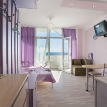 Включает в себя: кухня -студио, двухспальная кровать, кресло-кровать, комод, ТВ и Wi-Fi, кондиционер, посуда, электрочайник, электроплита, холодильник, постель, полотенце, санузел с душевой кабинкой, балкон с видом на море.
