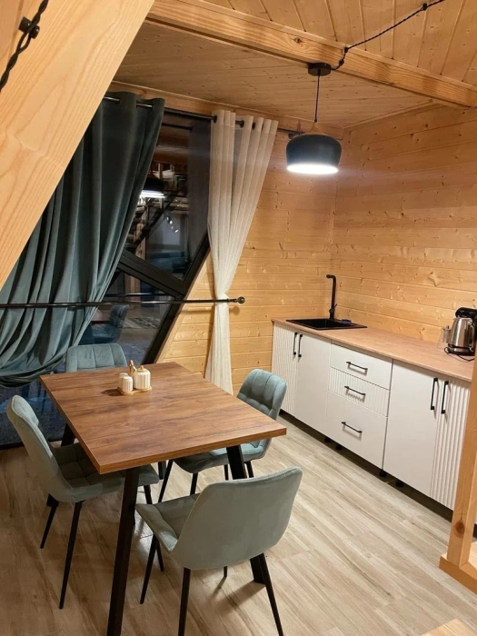 Дом A-frame рассчитан на проживание до 4 человек. Спальные места: двуспальная кровать, раскладной диван. Кухня оборудована необходимой посудой и техникой: холодильник, микроволновая печь, чайник. К услугам гостей также телевизор ,WiFi.