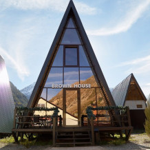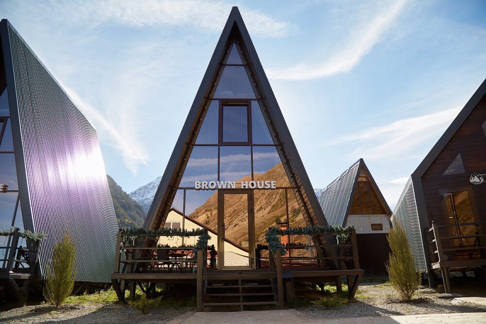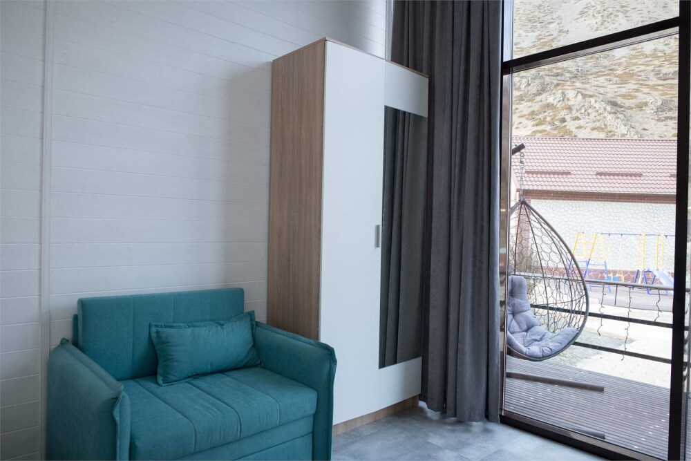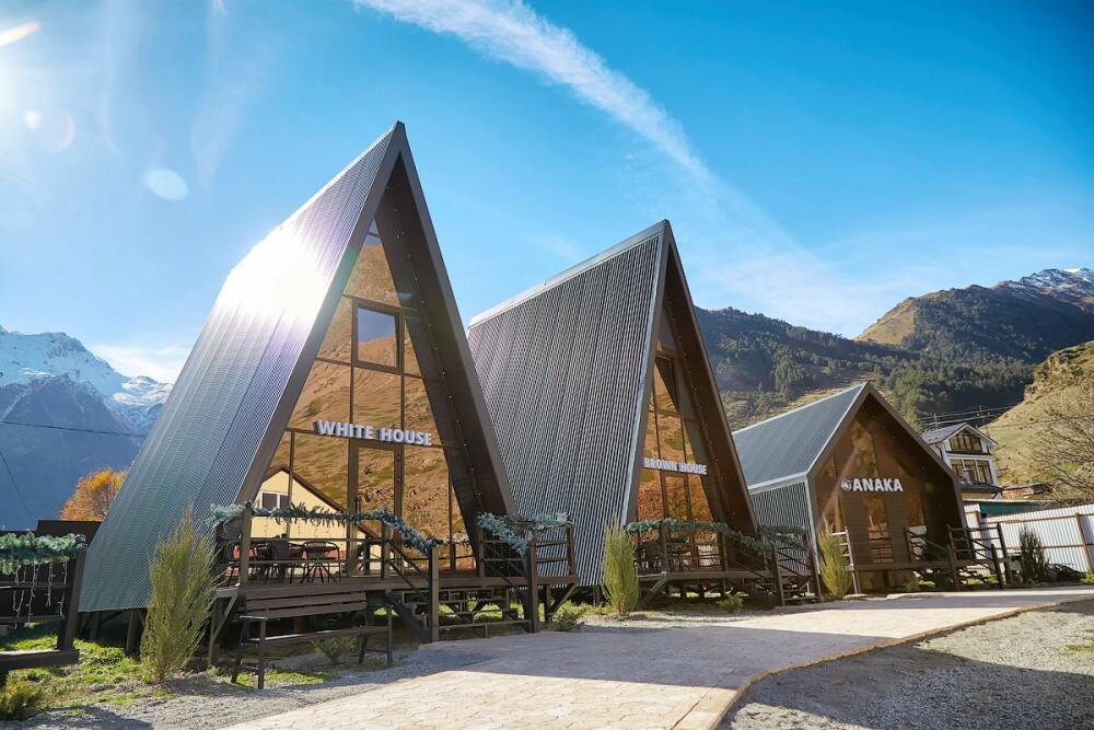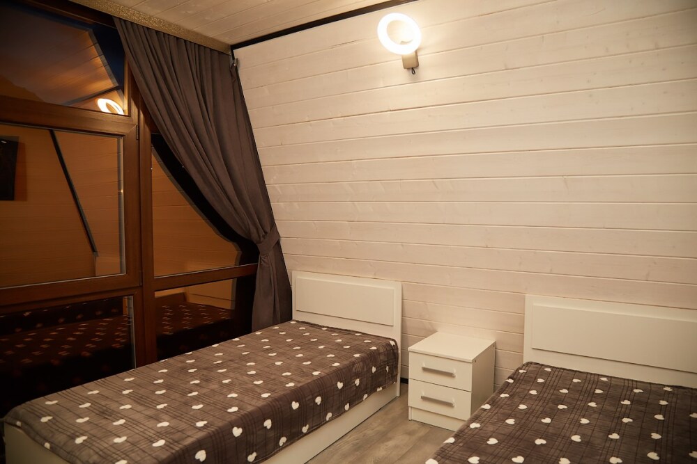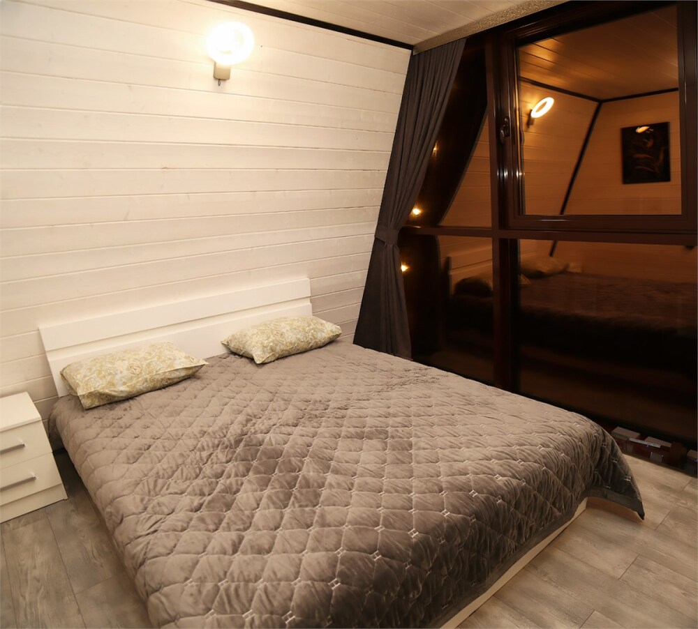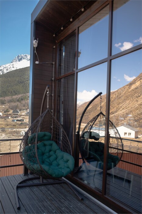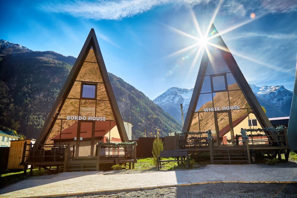A-Frame коттеджи: Каждый из трех трёхэтажных коттеджей в стиле A-Frame предоставляет роскошное пространство для жизни на трех уровнях. Они идеально подходят для размещения группы из 6-7 человек. На первом этаже находится просторная студия, которая объединяет кухню, гостиную и ванную комнату с душевой. Второй этаж радует двумя спальнями площадью 12 кв. м каждая, с панорамными окнами, открывающими вид на Баксанское ущелье и горы. Третий этаж — это эксклюзивная зона отдыха