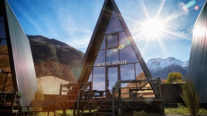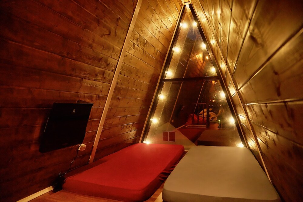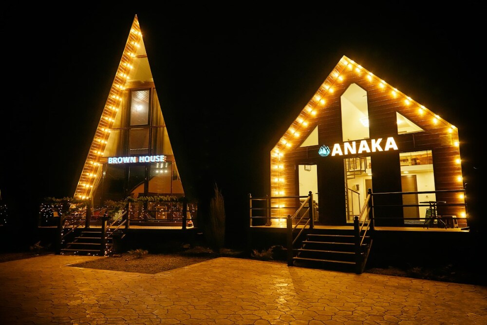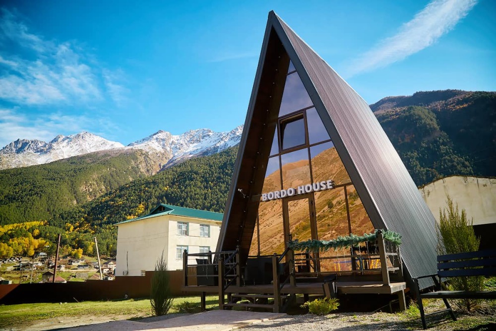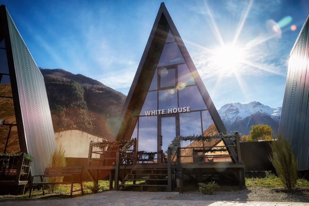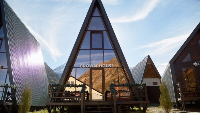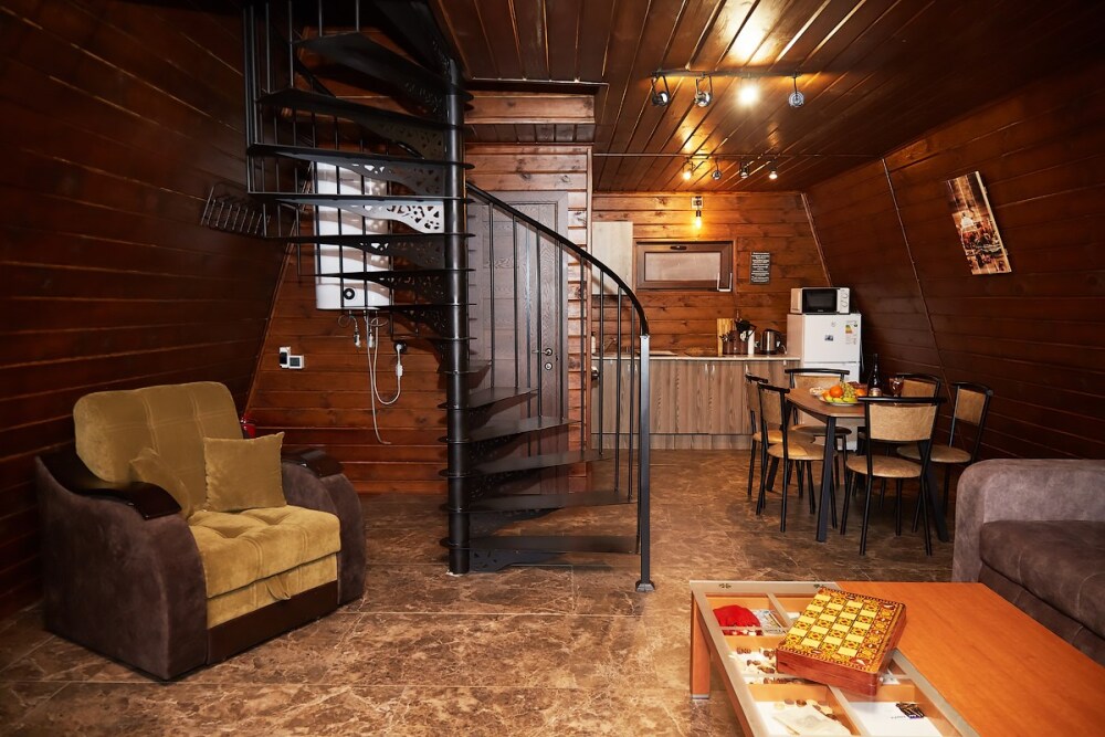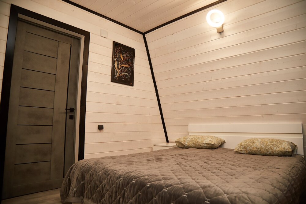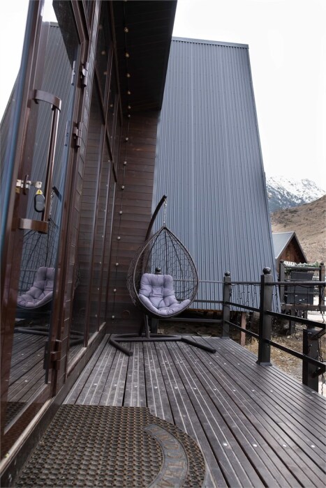 A-Frame коттеджи: Каждый из трех трёхэтажных коттеджей в стиле A-Frame предоставляет роскошное пространство для жизни на трех уровнях. Они идеально подходят для размещения группы из 6-7 человек. На первом этаже находится просторная студия, которая объединяет кухню, гостиную и ванную комнату с душевой. Второй этаж радует двумя спальнями площадью 12 кв. м каждая, с панорамными окнами, открывающими вид на Баксанское ущелье и горы. Третий этаж — это эксклюзивная зона отдыха