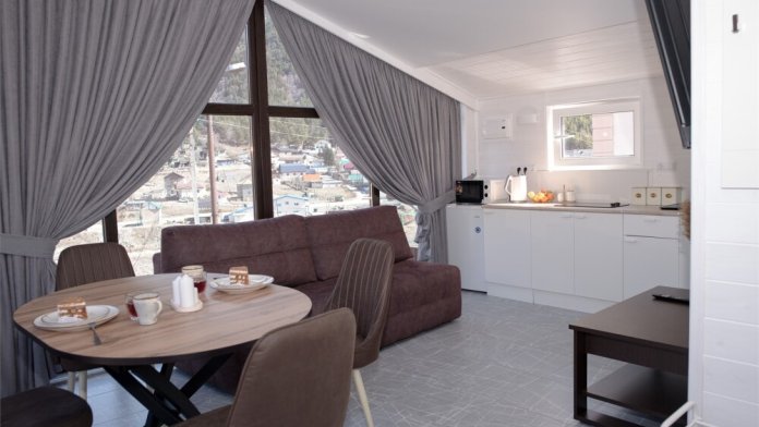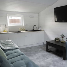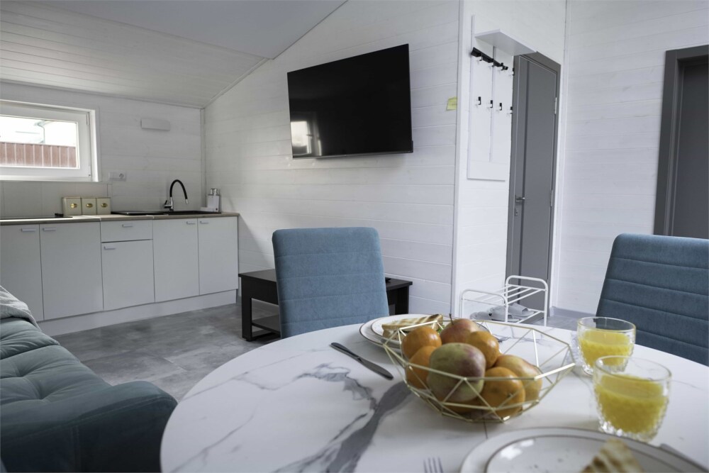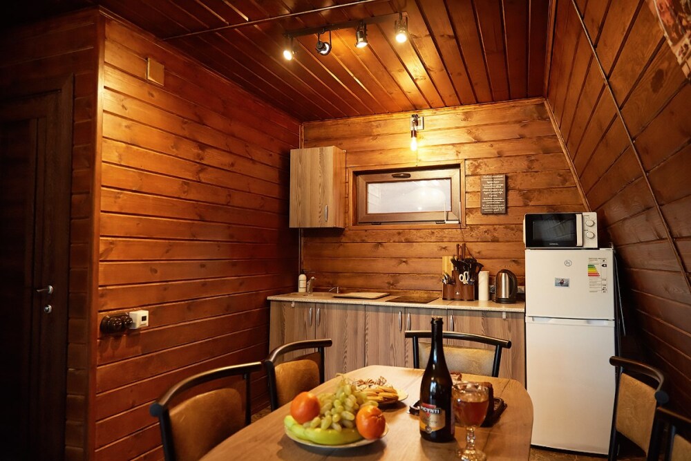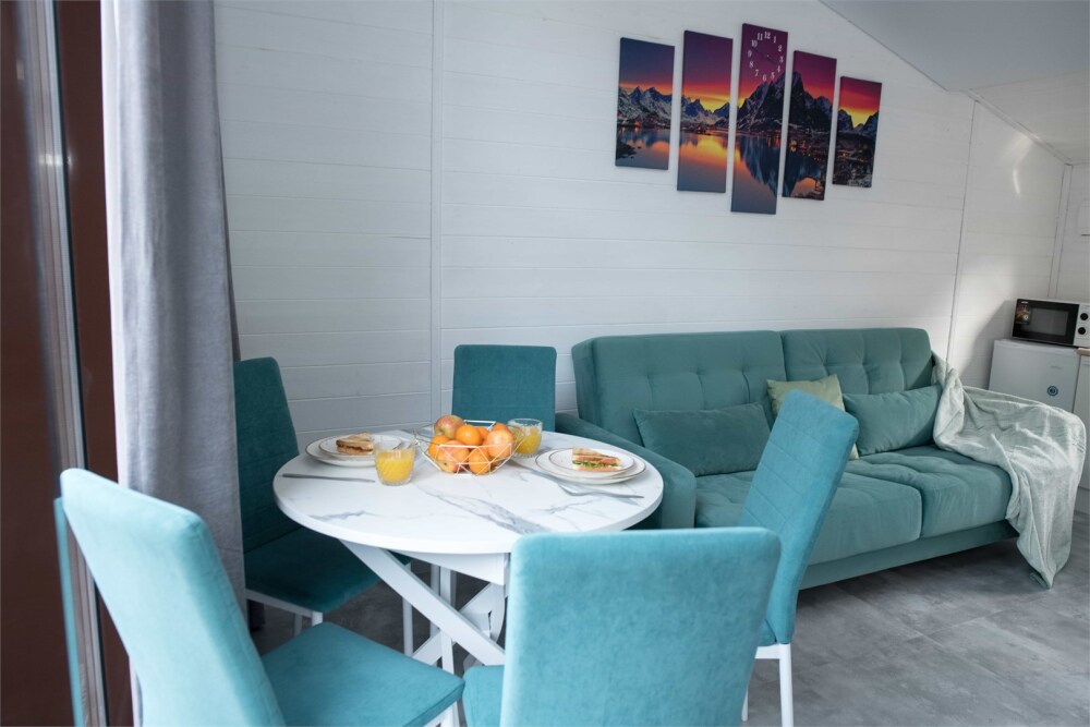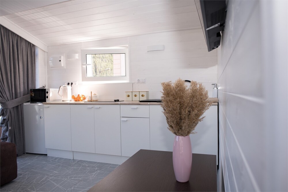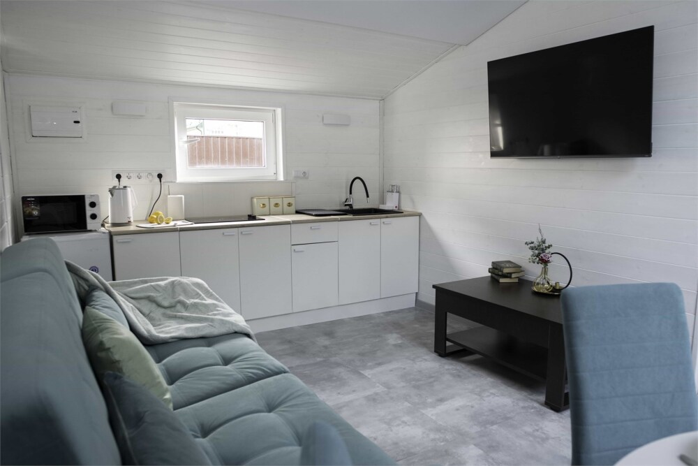 Домик 40 кв.м, две комнаты, санузел, в гостиной полноценная кухня. В каждом домике имеется всё для комфортного отдыха, холодильник, телевизор, WiFi, микроволновая печь, варочная панель, электрочайник, большой телевизор