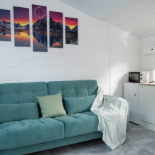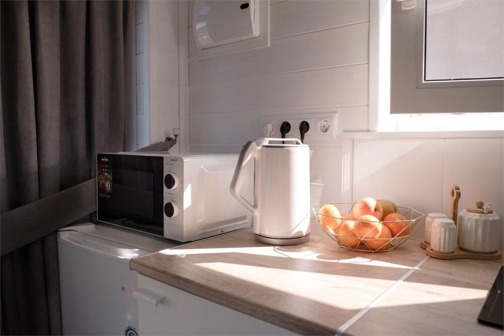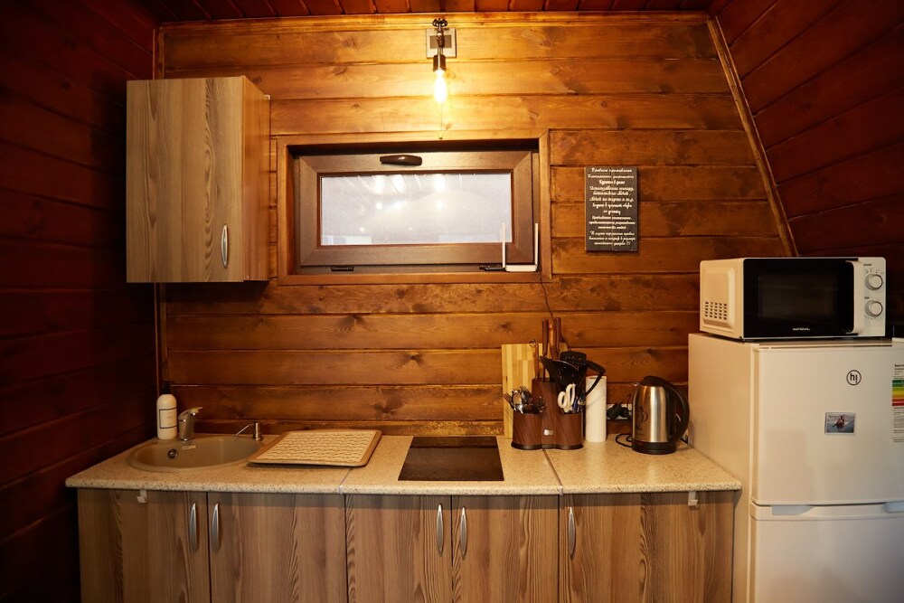 Домик 40 кв.м, две комнаты, санузел, в гостиной полноценная кухня. В каждом домике имеется всё для комфортного отдыха, холодильник, телевизор, WiFi, микроволновая печь, варочная панель, электрочайник, большой телевизор.