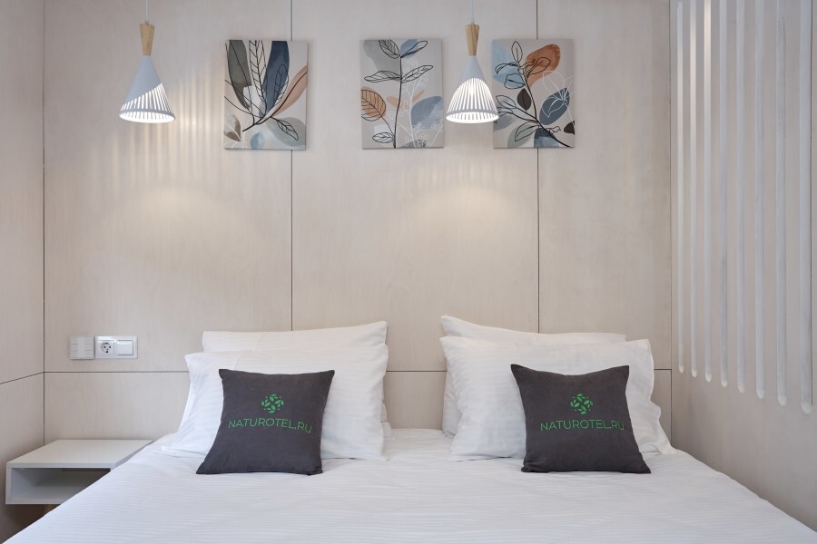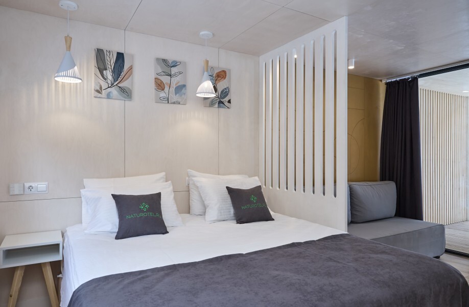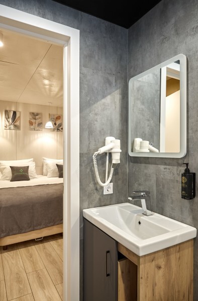 В спальной зоне гостей ждет двуспальная кровать queen size 180х200 или 2 отдельных односпальных. Качественный сон обеспечат ортопедические матрасы memory foam. А чтобы не терять связь с большим миром есть телевизор с кабельными каналами и Wi-Fi. Ощущение «как дома» гостям добавит санузел с раковиной, феном, душевой кабиной и стиральной машиной. Каждому жильцу выдаем комплект полотенец, халат, тапочки, косметику для душа. При этом Вам всегда хватит горячей воды с автономным нагревом, а на теплые полы будет приятно наступить после душа.