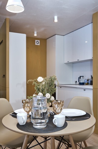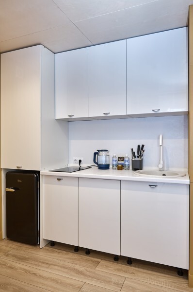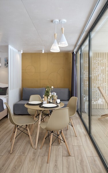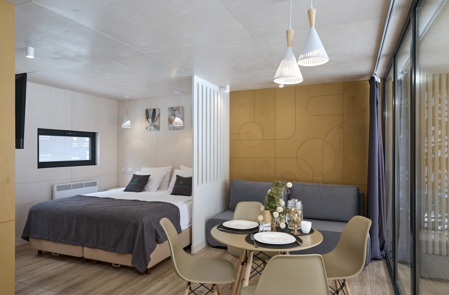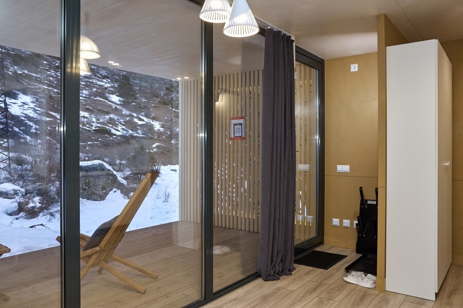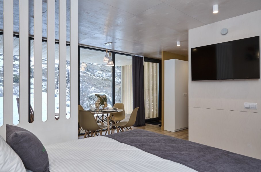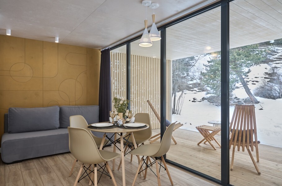 При входе гостей встречает раздевалка с сушкой для горнолыжной обуви. В гостиной расположился двухместный диван с ортопедическим матрасом и обеденный стол с 4-мя стульями возле панорамного окна. Кухня наполнена всем необходимым для комфорта: комплект посуды, индукционная плита, раковина, микроволновка, чайник и мини-холодильник. Гости могут пользоваться нашей доставкой еды или придерживаться привычного меню.