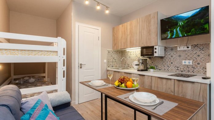 В квартире с комфортом могут разместиться четыре человека. Соседи отличные.