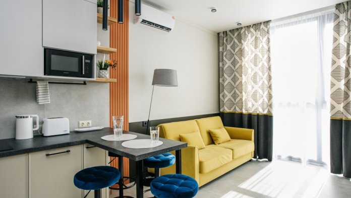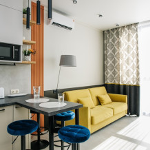 В квартире с комфортом могут разместиться четыре человека. В квартире есть: зона отдыха на антресольном уровне, фен, панорамные окна с видом на внутренний двор, телевизор со SmartTV, кондиционер. Кухня оснащена: холодильником, кофемашиной, плитой, электрическим чайником, микроволновой печью, чай, кофе, сахар, соль, перец, подсолнечное масло всегда в наличии.