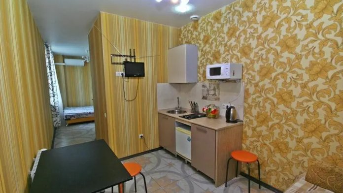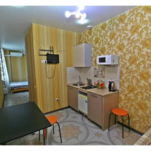 В студии есть: стиральная машина, телевизор, мини-кухня с холодильником, плитой, микроволновой печью, чайником и посудой, утюг, сушилка для белья, постельное белье и полотенца.