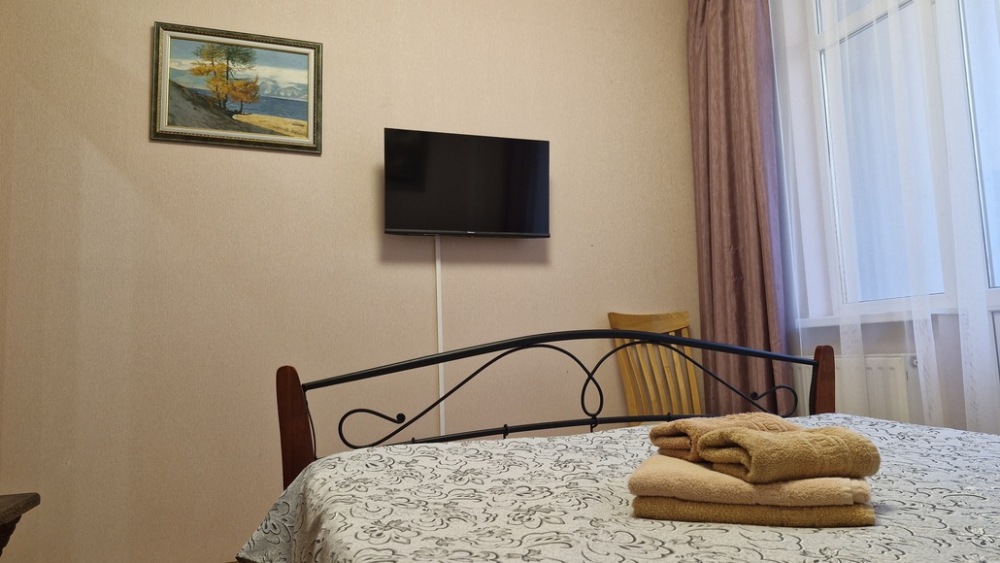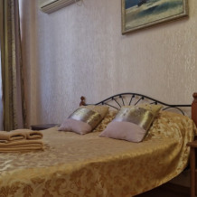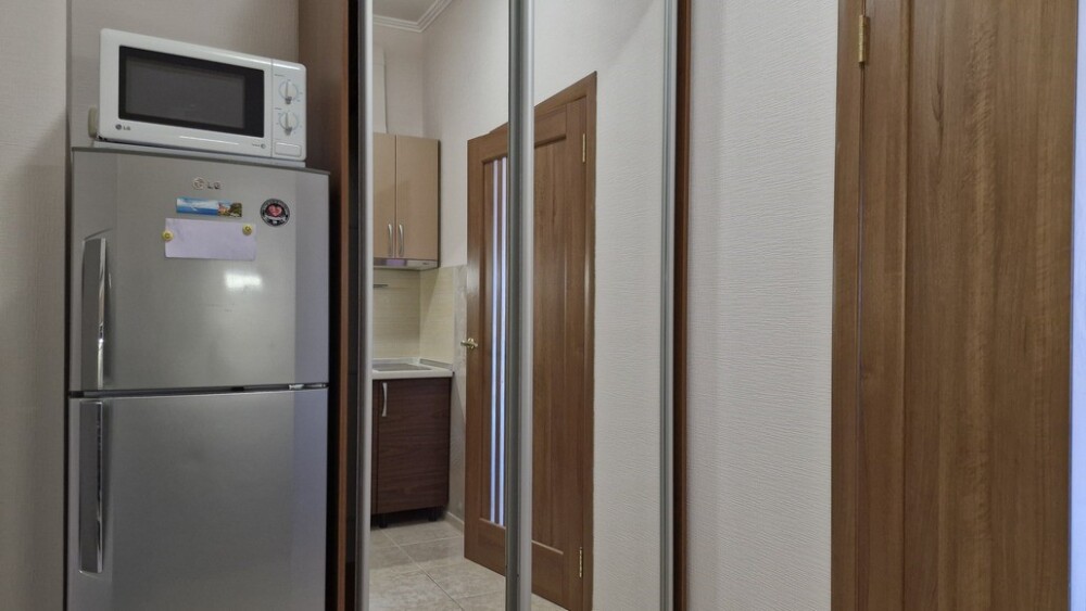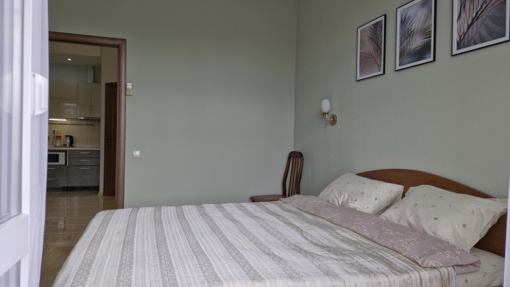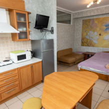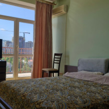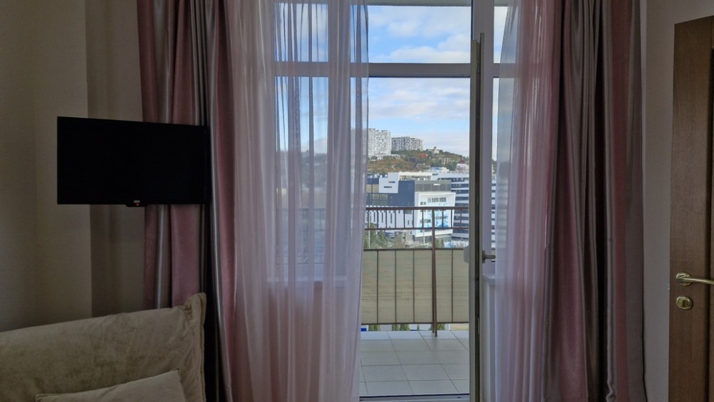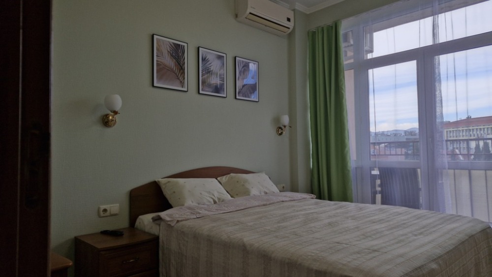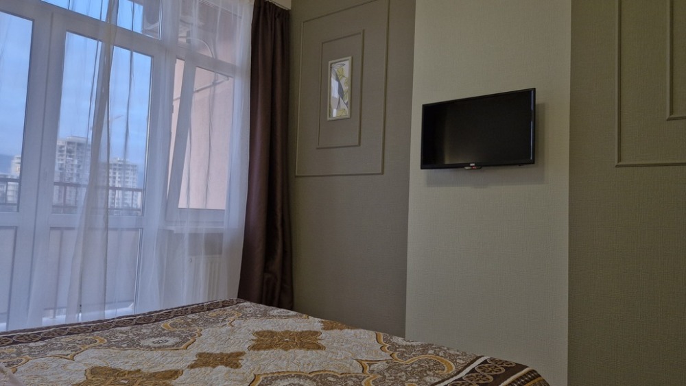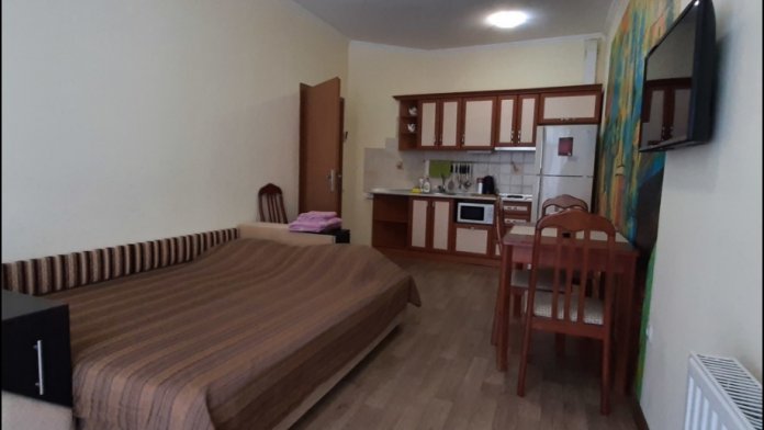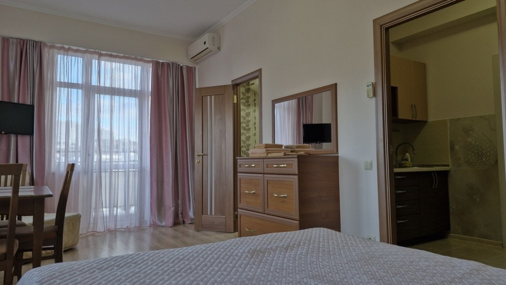 Квартира состоит из комнаты, с прихожей, кухни и совмещенного санузла. В квартире есть мебель – двуспальная кровать, кресло-кровать, шкаф, комод, оборудованная кухня с электроплитой, холодильник, микроволновка, чайник электрический, необходимая посуда, кондиционер, спасающий от летней жары, телевизор, интернет. Есть балкон с балконной мебелью, площадью – 7 кв.м. с которого открывается хороший вид.