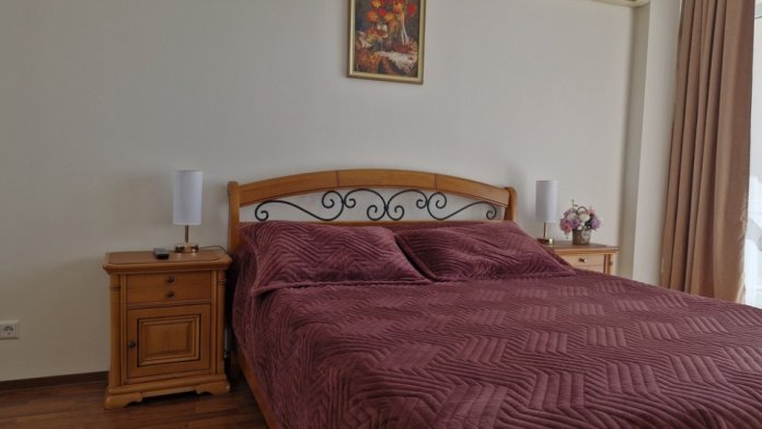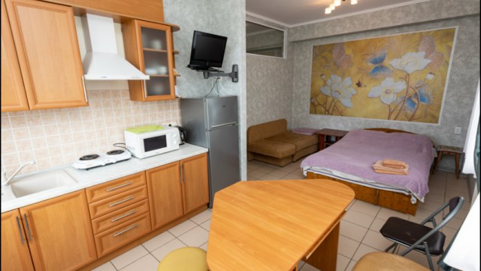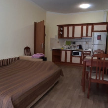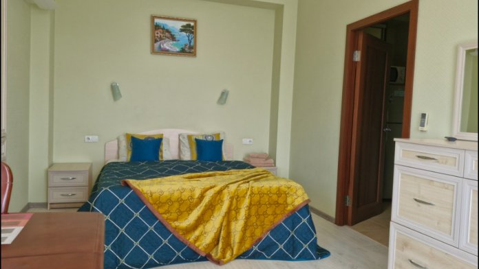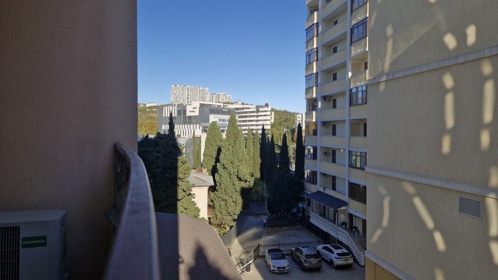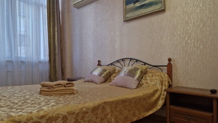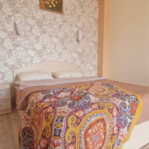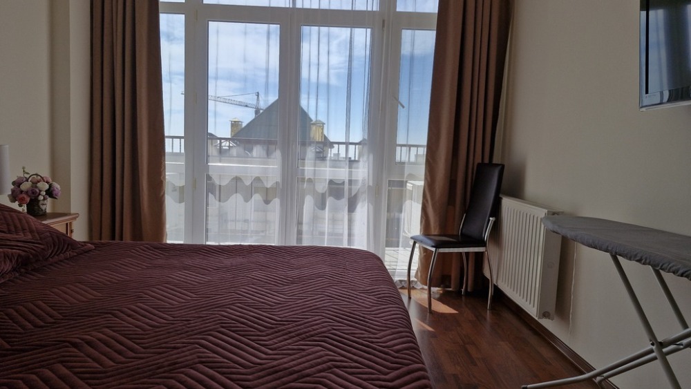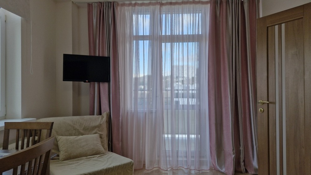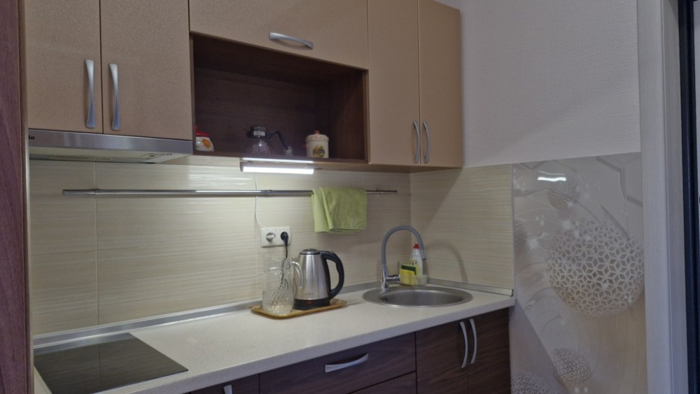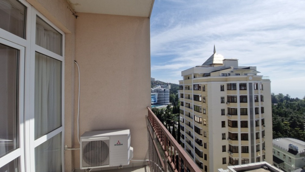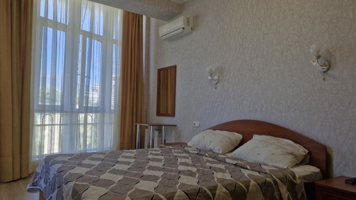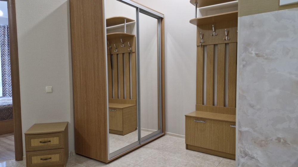Квартира состоит из комнаты, с прихожей, кухни и совмещенного санузла. В квартире есть мебель – двуспальная кровать, кресло-кровать, шкаф, комод, оборудованная кухня с электроплитой, холодильник, микроволновка, чайник электрический, необходимая посуда, кондиционер, спасающий от летней жары, телевизор, интернет. Есть балкон с балконной мебелью, площадью – 7 кв.м. с которого открывается хороший вид.