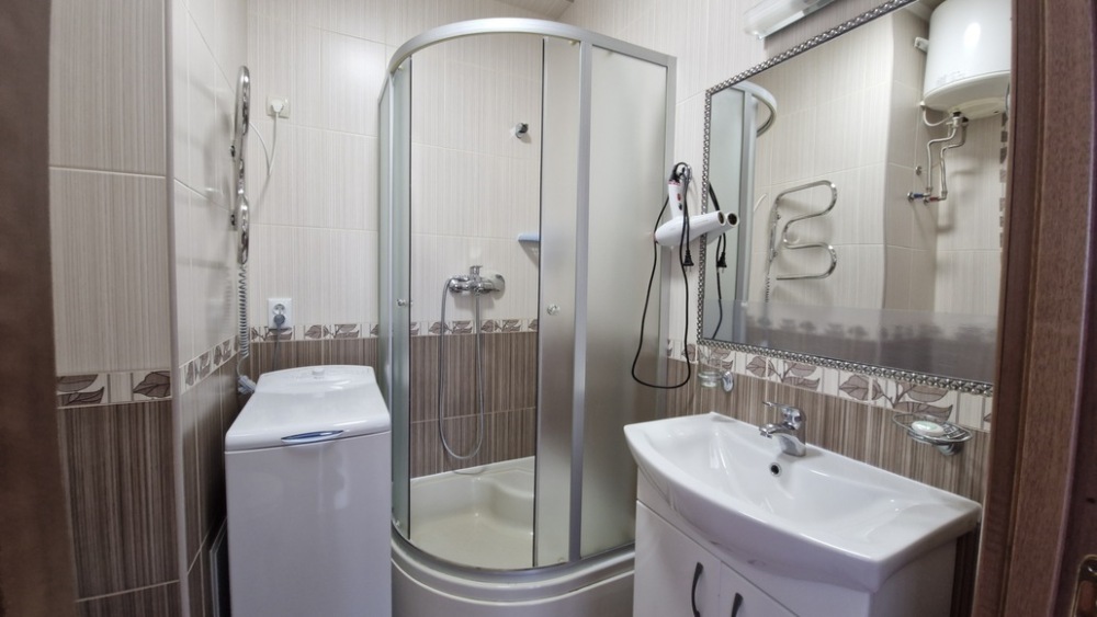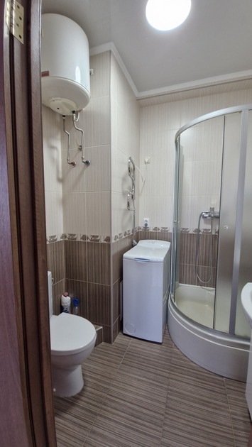 Чистый санузел с душевой кабиной, бойлером и стиральной машиной.