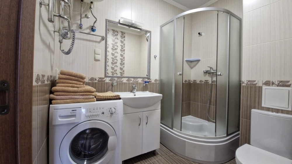 Современный санузел: душевая кабина, бойлер, стиральная машина.