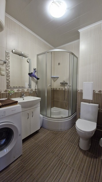 Новый санузел: душевая кабина, стиральная машина, фен, полотенца.