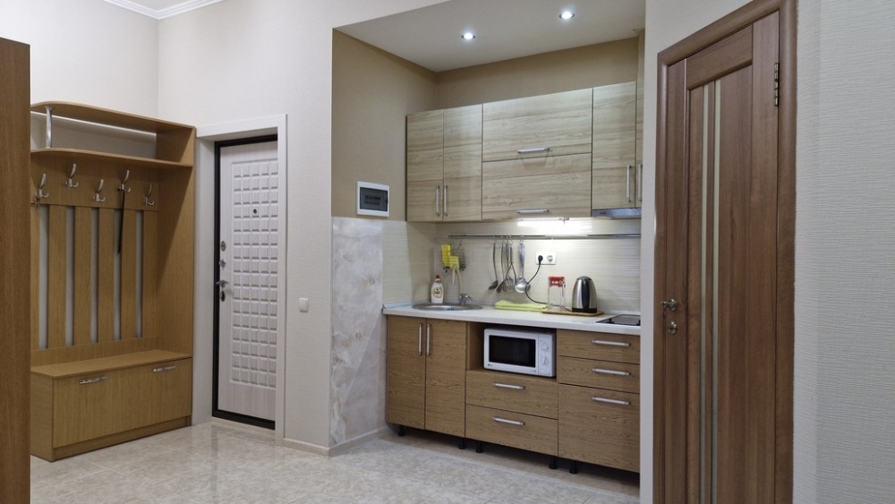 Мини-кухня: варочная панель, холодильник, микроволновка, посуда, обеденная зона на 3 персоны;