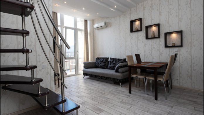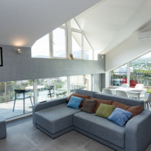 1-й этаж: спальня с панорамным балконом (5м2) и отдельным санузлом, гостиная-кухня с панорамными окнами, 2 балкона (столики и стулья);