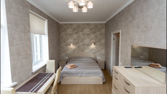 2 отдельные зоны: спальня с двуспальной кроватью и комодом + кухня-столовая с обеденным столом.