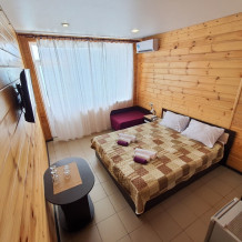 Номер укомплектован двуспальной кроватью с новым ортопедическим матрасом и небольшим диваном – всего три полноценных спальных места.