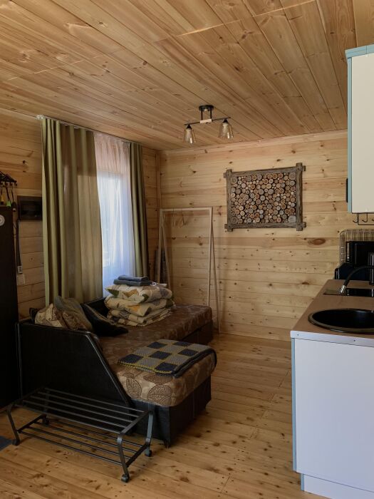 Новый уютный дом в стиле А-фрейм с отдельной спальней и вторым светом, так же есть двуспальное место на антресоли. В кухни-столовой удобный раскладной диван. Дом оборудован всем необходимым для жизни. В кухонной зоне есть холодильник, микроволновая печь, индукционная печь, кофемашина, электрический чайник, столовые приборы, турецкий фарфоровый сервис, чайные и кофейные чашки, набор кастрюль и сковорода, телевизор и интернет, парковка.