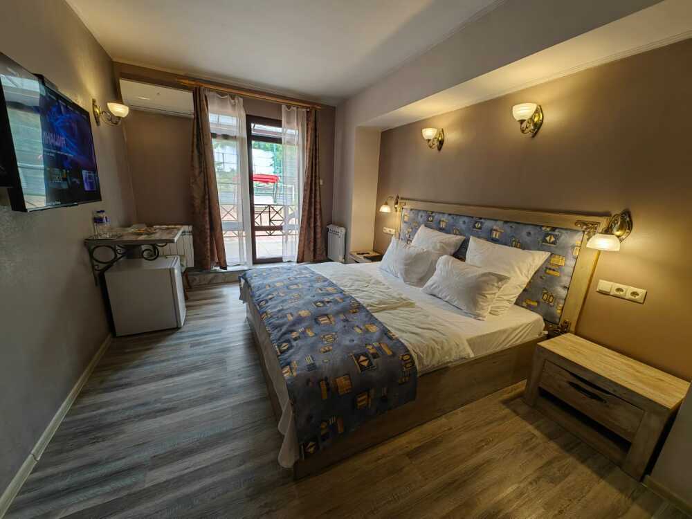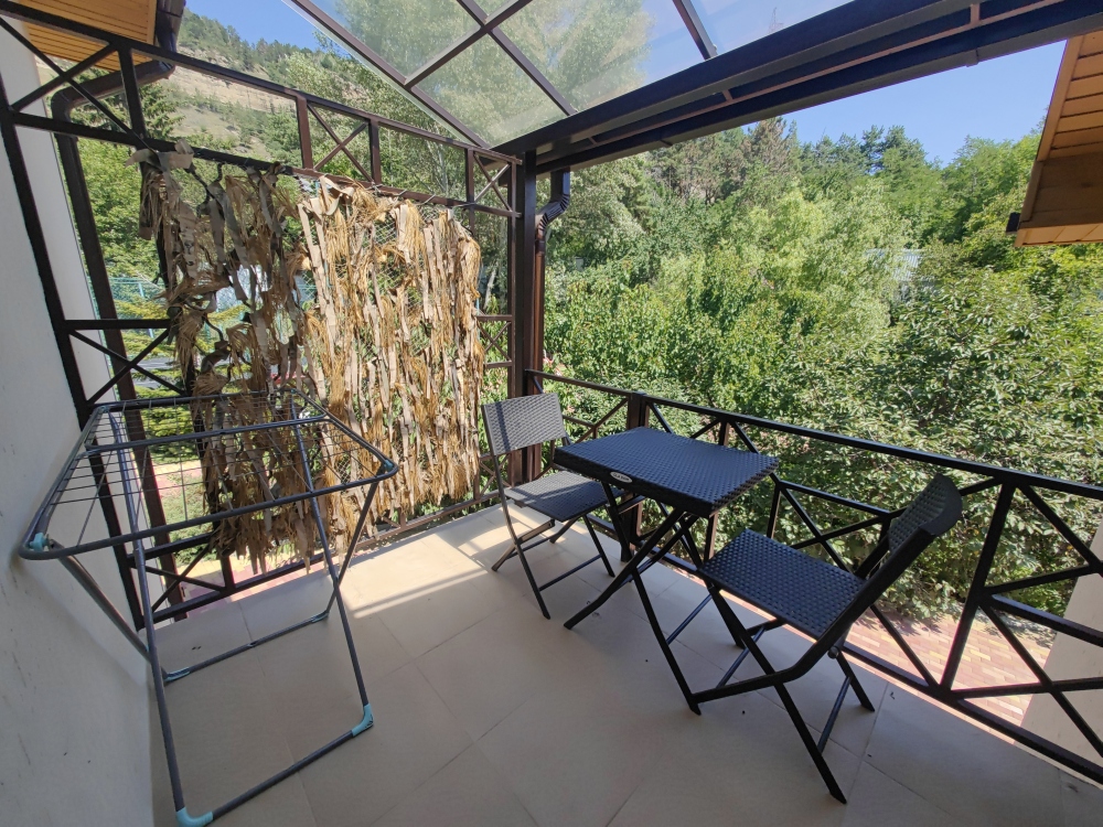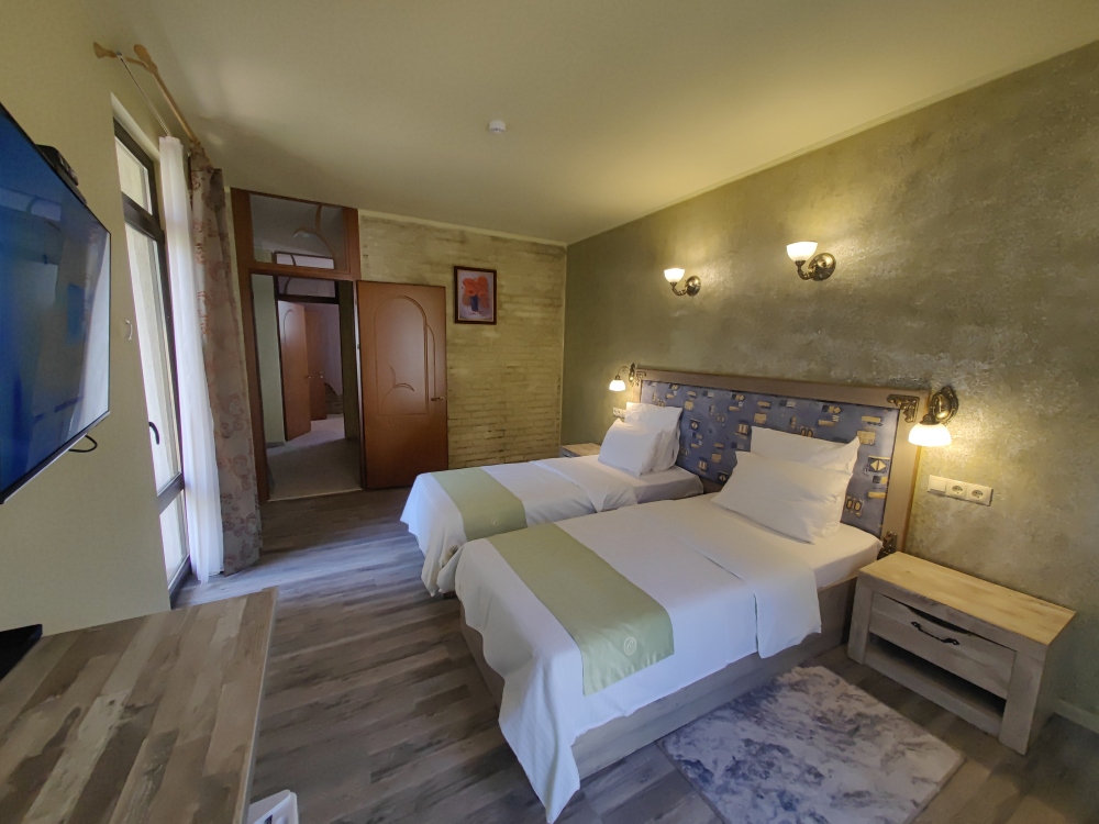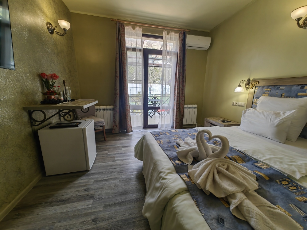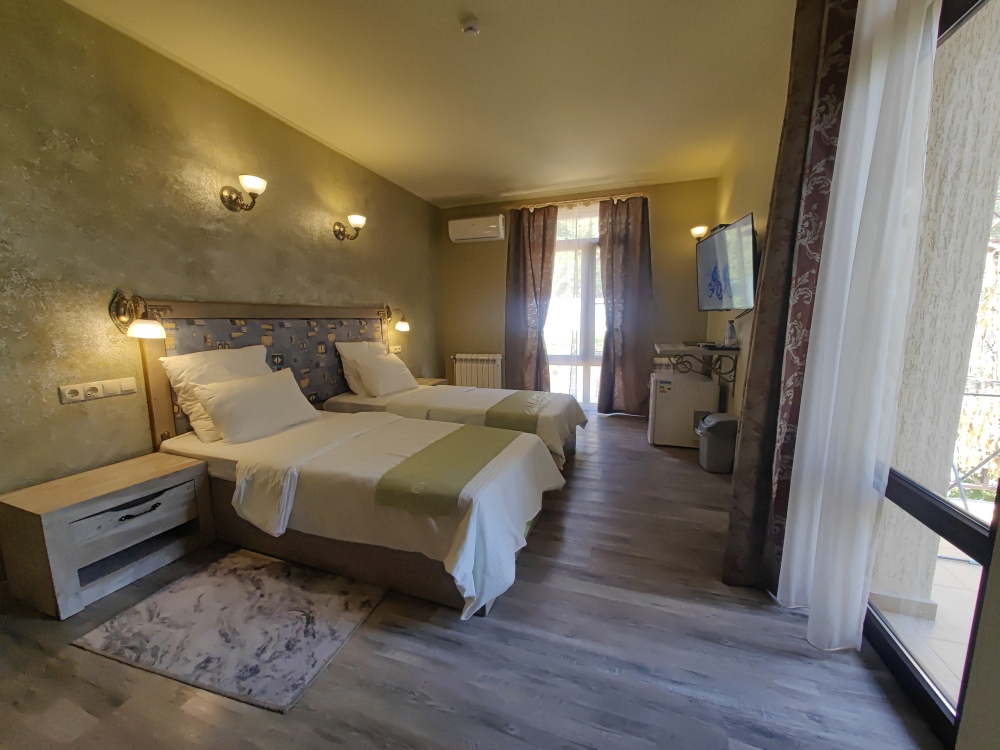 Двухместный номер, с доп. местом. К Вашим услугам: кондиционер, халаты, тапочки, полотенца, фен, мини-холодильник, сейф, телевизор. В номере имеется терраса с видом на горы и лесной массив. Все номера выполнены в стиле лофт. Проживание от двух суток.