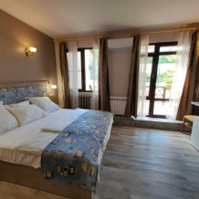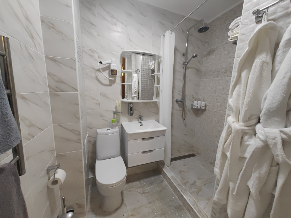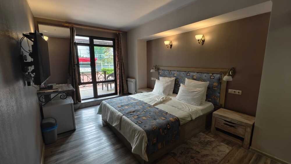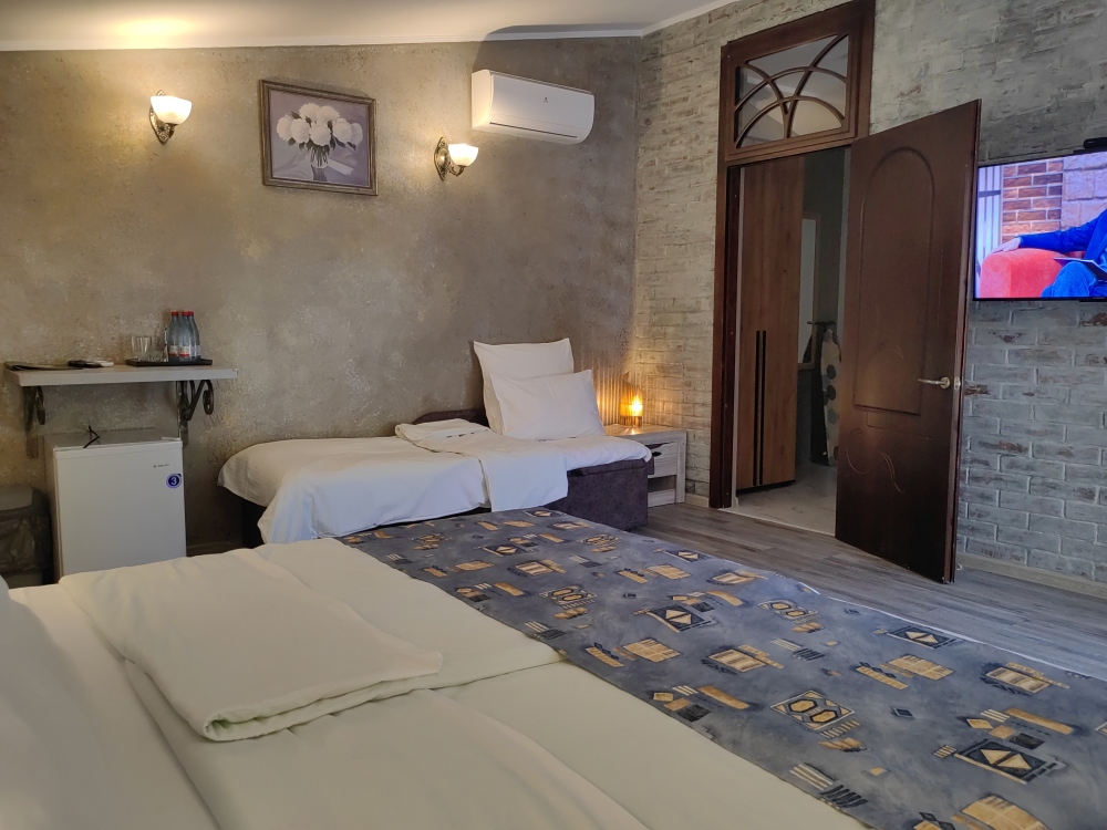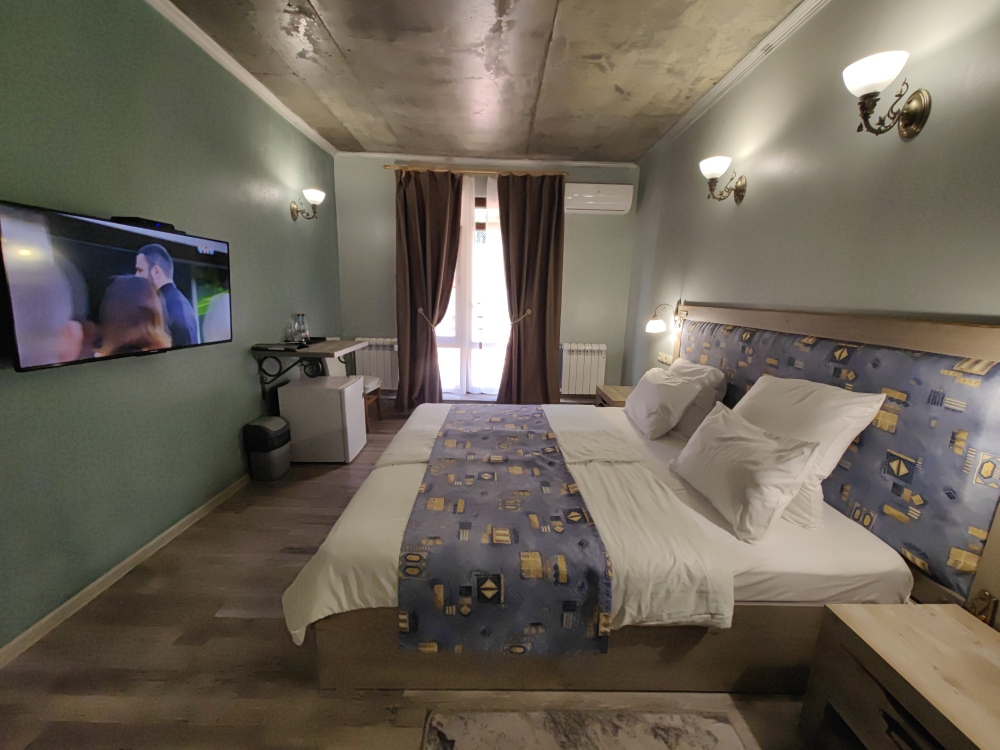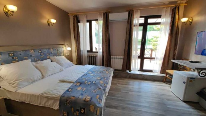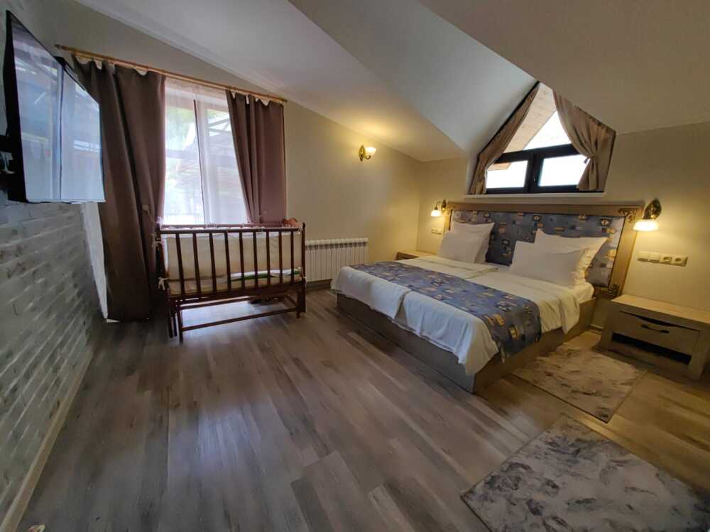 Двухместный номер, с доп. местом. К Вашим услугам: кондиционер, халаты, тапочки, полотенца, фен, мини-холодильник, сейф, телевизор. В номере имеется терраса с видом на горы и лесной массив. Все номера выполнены в стиле лофт. Проживание от двух суток.