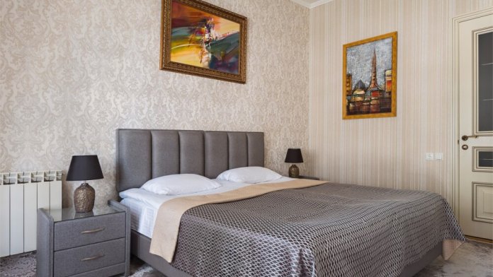 В номере спальня с кроватью «King size» с ортопедическим матрасом и комодом. В гостиной есть дополнительная односпальная кровать, телевизор с плоским экраном, сейф, обеденный стол, мини-холодильник, гардероб.