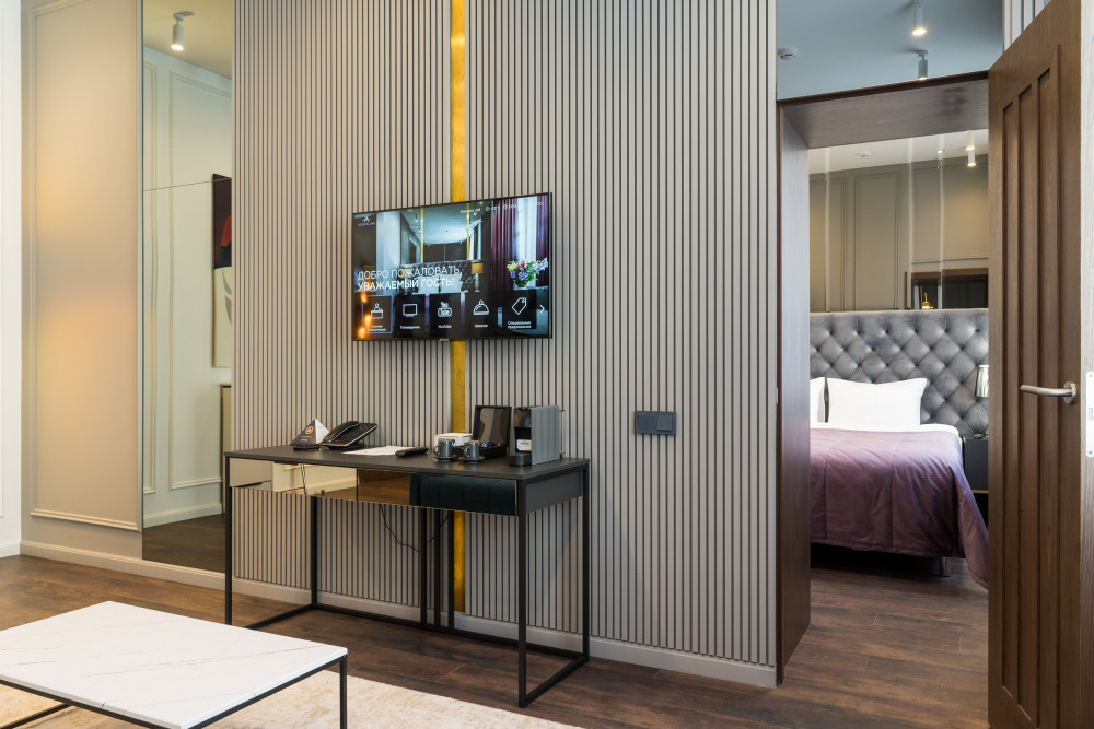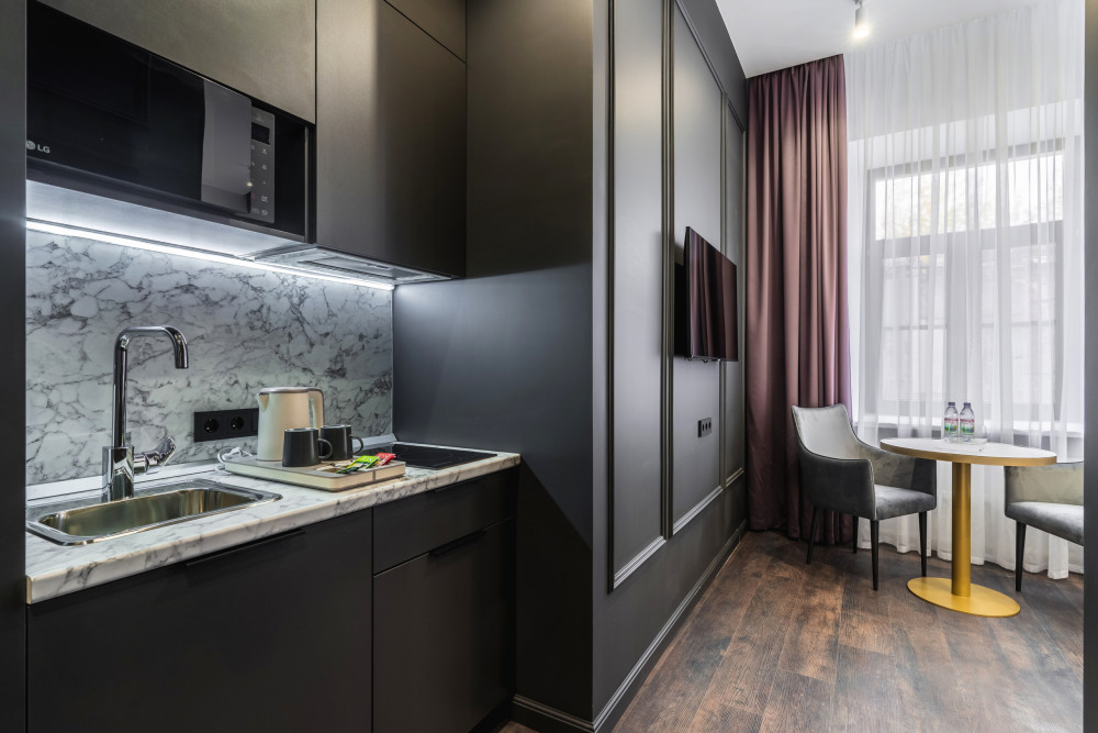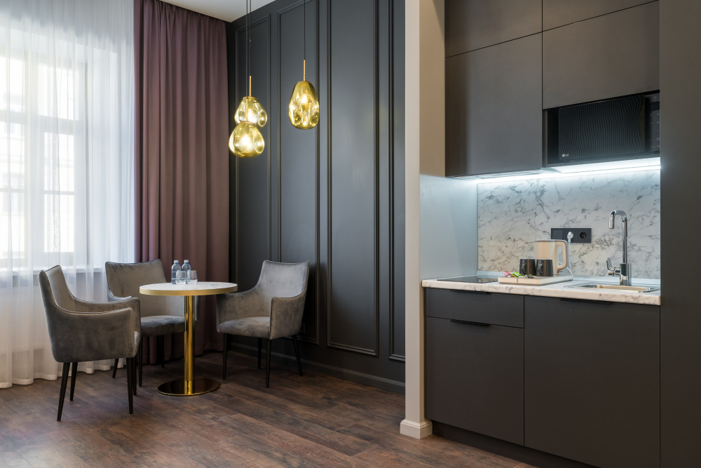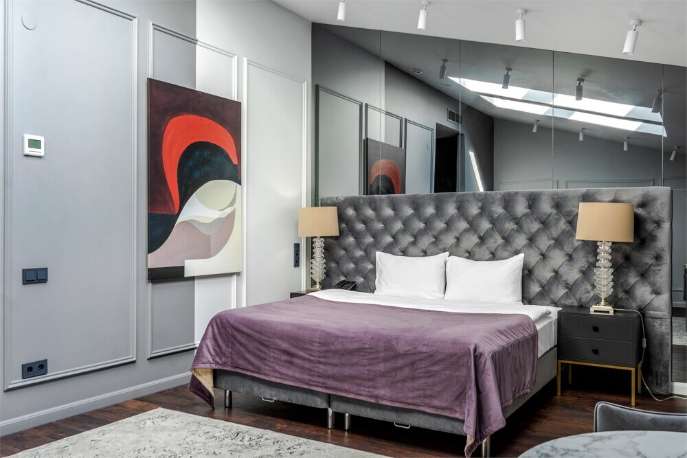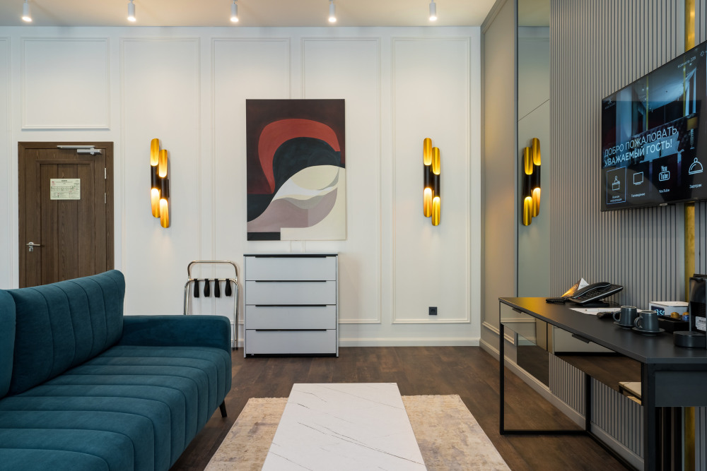 Просторный дизайнерский номер имеет две комнаты: спальню с двуспальной широкой кроватью и гостиную с диваном, кухонной и обеденной зоной.