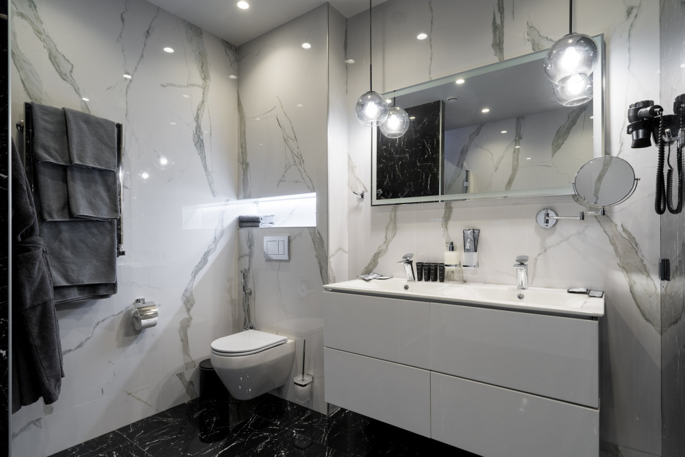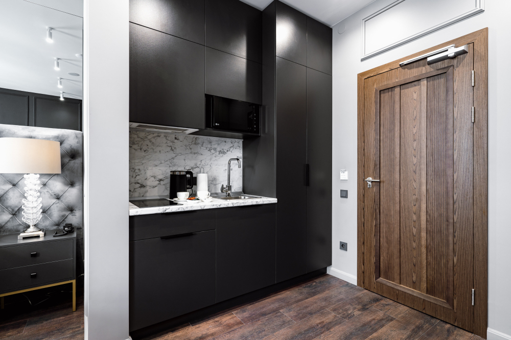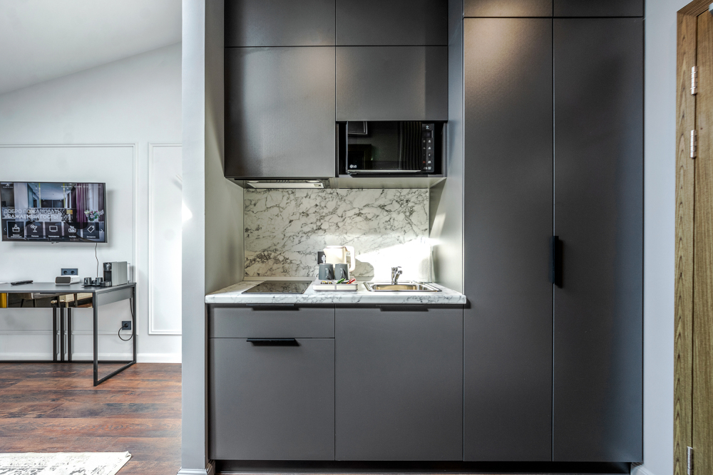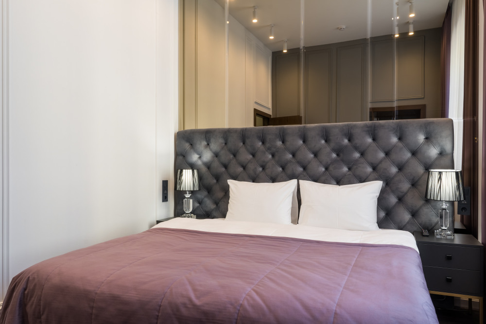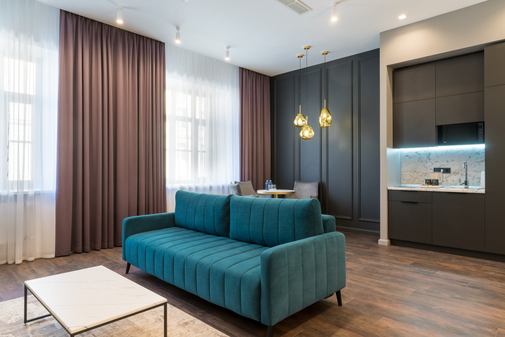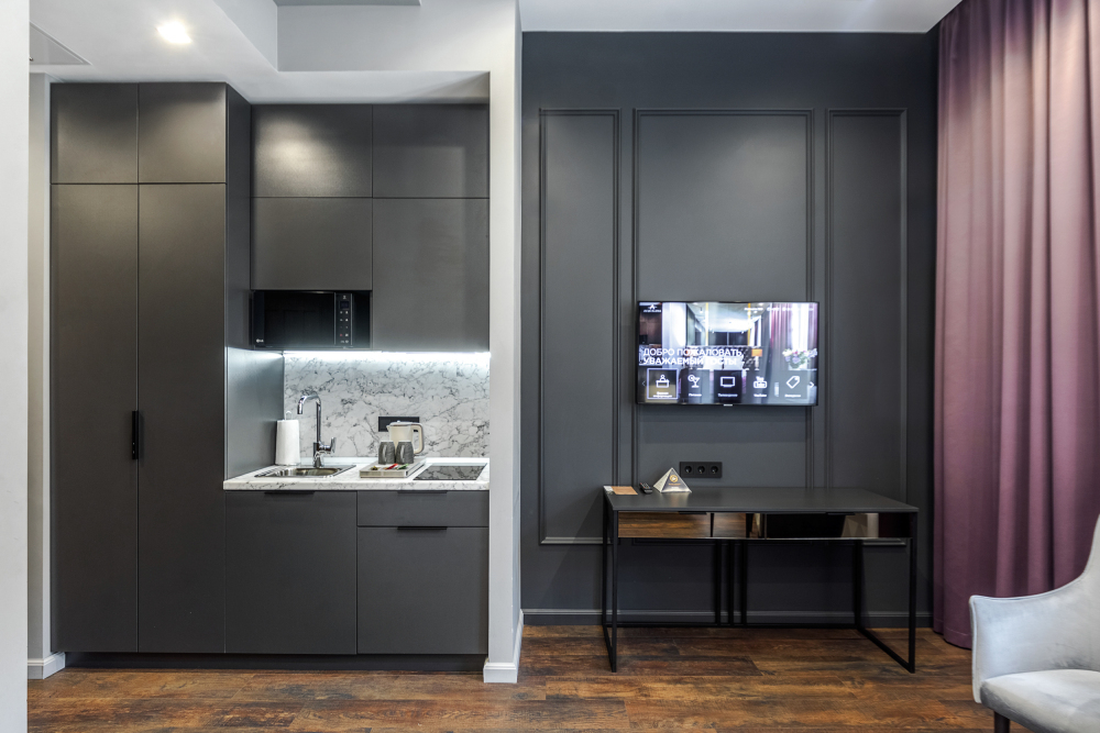 Просторный дизайнерский номер имеет две комнаты: спальню с двуспальной широкой кроватью и гостиную с диваном, кухонной и обеденной зоной.