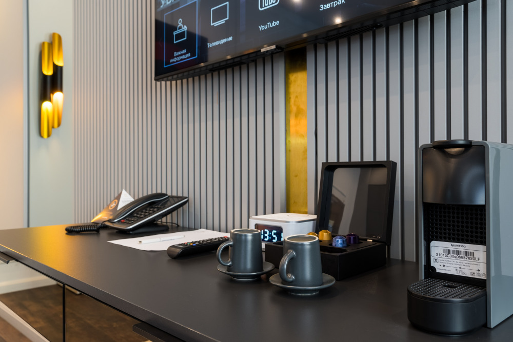 Вы сможете приготовить бодрящий ароматный кофе в любое время (капсульная кофемашина находится в номере). В каждом номере чайная станция, док-станция, тапочки и халаты.