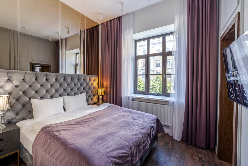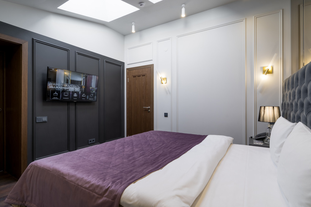 Номера категории «Мансардный стандарт», расположенные на 5 (последнем) этаже отеля имеют мансардное остекление, что позволит гостям любоваться белыми ночами летом и пушистым снегом зимними вечерами.