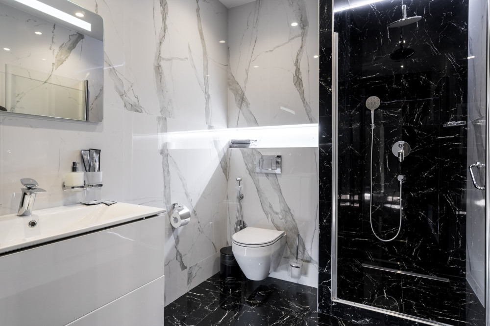 Просторная ванная комната имеет вход со стороны спальни и оборудована вместительной душевой кабиной, сдвоенной раковиной для умывания и туалетом, феном.