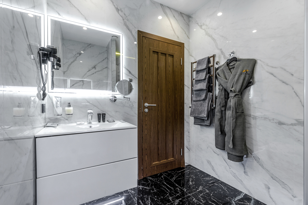 Просторная ванная комната имеет вход со стороны спальни и оборудована душевой кабиной, раковиной для умывания и туалетом, феном.
