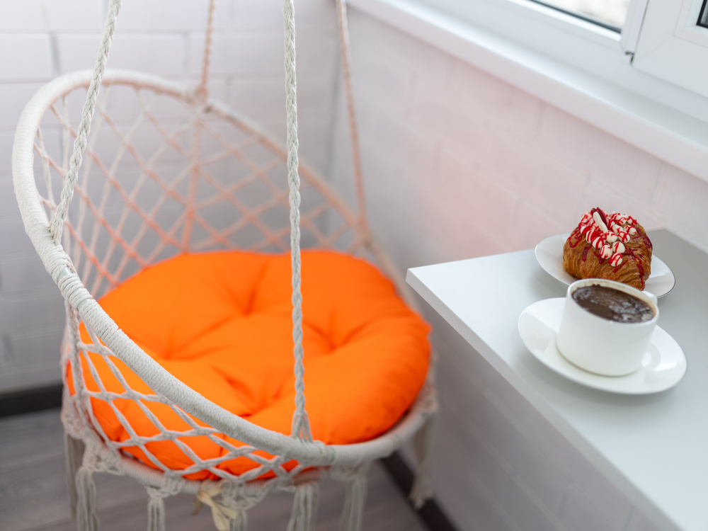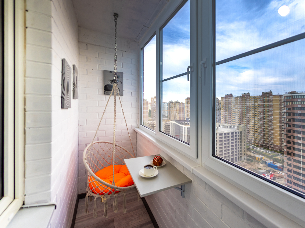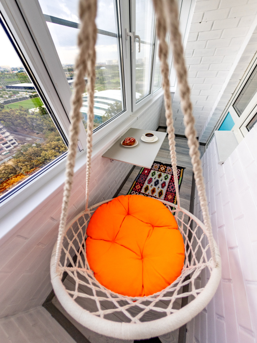 Уютный балкон с качелями: Идеальное место для отдыха и релакса с чашкой кофе или бокалом вина.
