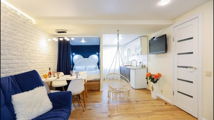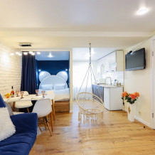 В студии сделан новый дизайнерский ремонт, есть шумоизоляция: телевизор, фен, утюг, удобный большой ортопедический диван и кровать (160/200), современная кухня со всем необходимым, микроволновая печь, санузел с душевой, средства гигиены, стиральная машина, постельное белье, полотенца, продуманная система освещения, гардеробная.