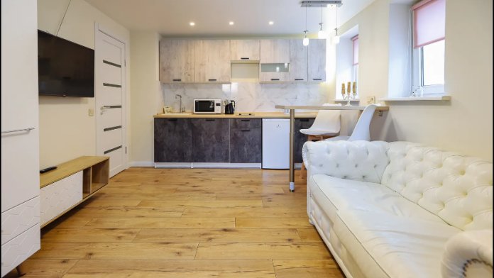 В гостиной: диван, который при желании можно расправить 300/300, телевизор, обеденный стол, стулья.