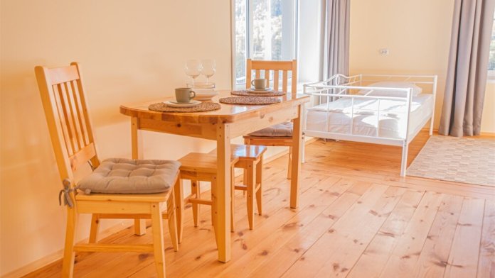 Двухместный номер с одной двуспальной кроватью, с кухней и ванной комнатой в номере, с прекрасным видом из окна на Катунь.