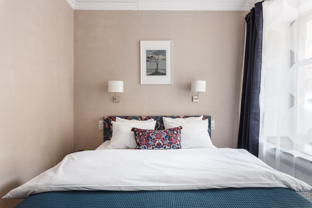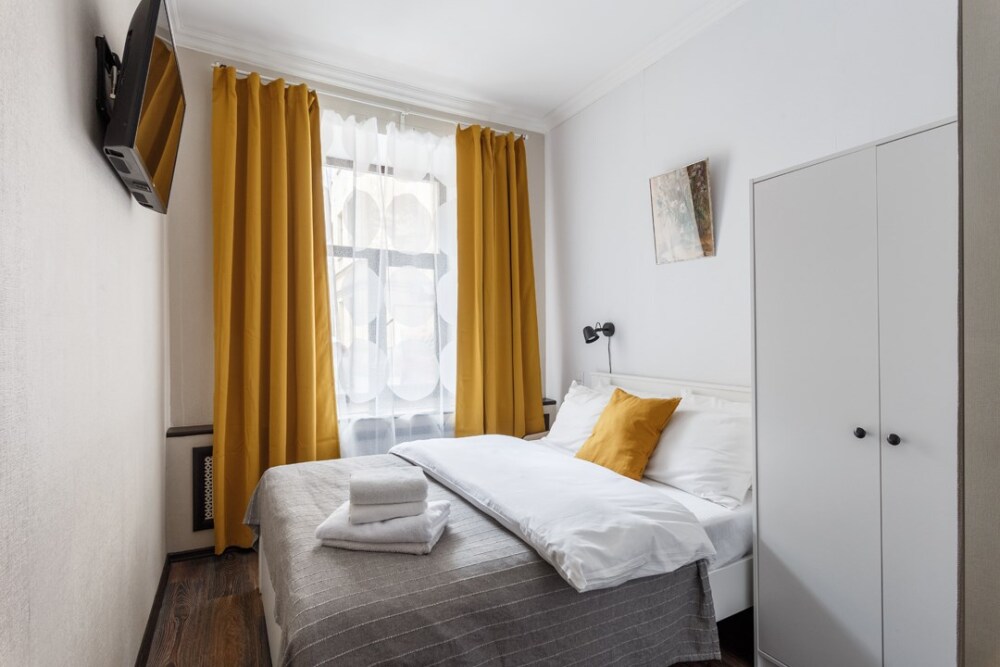 Уютная комната для сдачи посуточно с видом на улицу для двоих гостей в центре Петербурга у Исаакиевского собора. Стиральная машина и утюг – в общем доступе