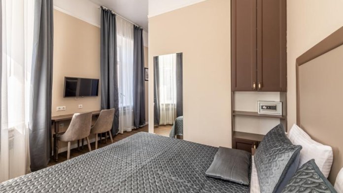 Самый просторный номер из всех категорий имеет ванную комнату, мини-кухню с кондиционером. Изюминка номера 4 больших окна вид, из которых открывается на всю площадь Восстания и Невский проспект. К услугам гостей бесплатные косметические принадлежности, банные халаты, тапочки, wi-fi, чай, кофе, кулер. Для Вашего комфорта имеется в обще зоне кофемашина с зерновым ароматным кофе
