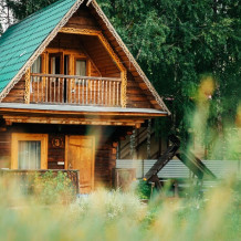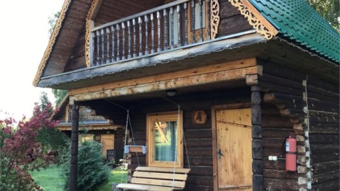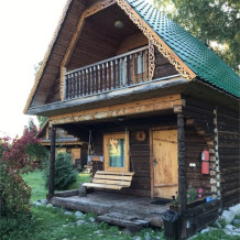Двухэтажный дом из дерева, 1 этаж - отдельный вход. Маленькая терраса. Две односпальные кровати, двуспальный диван, стол, стулья, холодильник, чайник, набор посуды. Душ, туалет. Комплект полотенец.